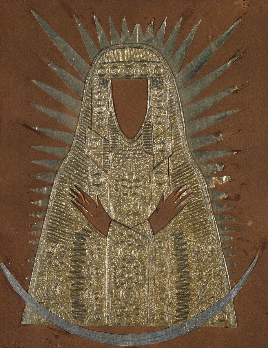 Collage, papier, sklejka; 23,5 x 19,5 cm;Na odwrocie papierowa nalepka z maszynopisem: „MOTHER OF GOD OF OSTRA BRAMA” / WILNO / Poland / ,1941. / H. Sajdak