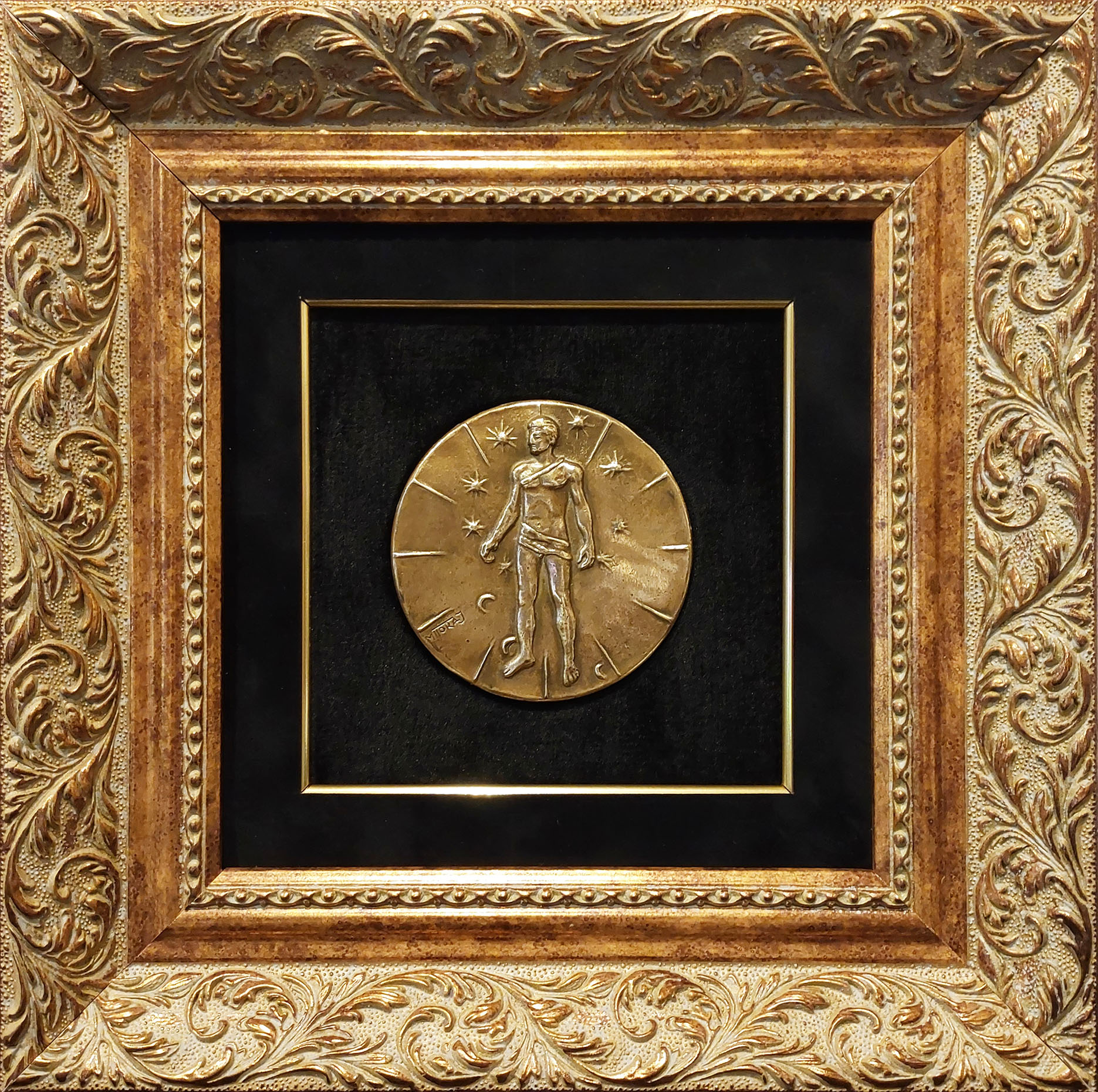 rzeźba / brąz, 9 × 9 cm, sygnatura: awers, lewa strona: 'Mitoraj', rewers: numer edycji oraz stempel z napisem w otoku: EXPERIMENTATION MULTICENTRIQUE PFIZER 83–84; medal oprawiony (wymiary z oprawą 31 cm x 31 cm)