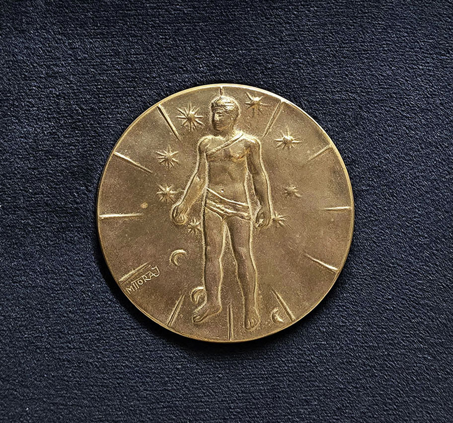 rzeźba / brąz, 9 × 9 cm, sygnatura: awers, lewa strona: 'Mitoraj', rewers: numer edycji oraz stempel z napisem w otoku: EXPERIMENTATION MULTICENTRIQUE PFIZER 83–84; medal oprawiony (wymiary z oprawą 24.5 x 24.5 cm)