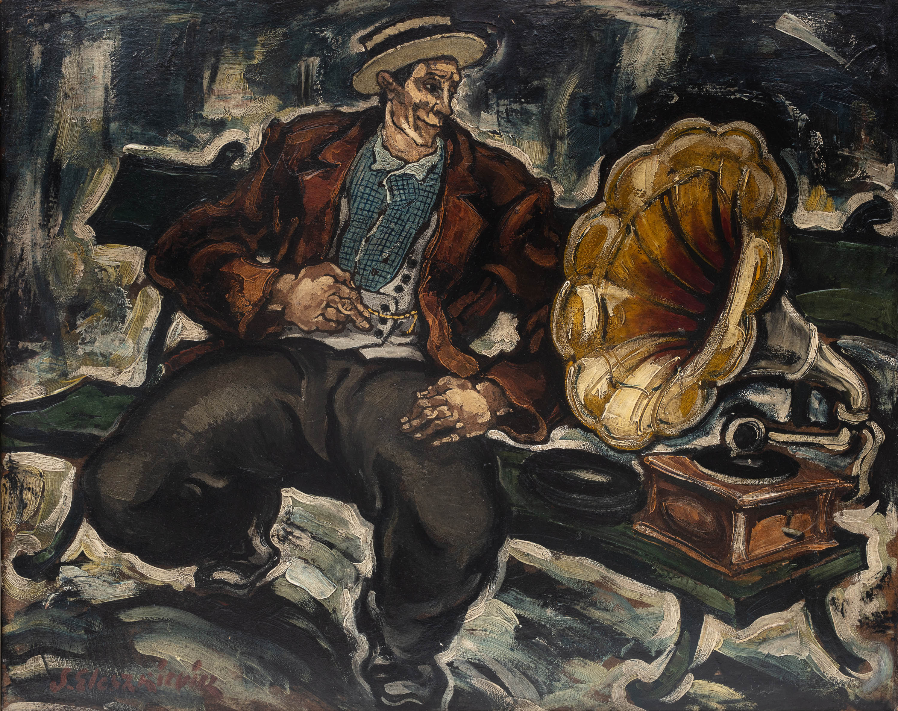 Artysta związany z kręgiem École de Paris i bliski estetyce ekspresjonizmu, przedstawił postać mężczyzny siedzącego na ławce obok gramofonu z tubą. Zdecydowane i zamaszyste ruchy pędzla sprawiają, że prezentowany obraz zdaje się pulsować. Niemal słyszymy dźwięki wydobywające się z gramofonu. Scena na pozór prosta i anegdotyczna, nabiera intensywności dzięki technice, którą posługiwał się Stanisław Eleszkiewicz. „Dniem i nocą studiował kolory, mieszał barwy, robił zestawienia kolorystyczne i badał nowe metody malarskie. Doskonale przypominam sobie skrawki płócien, na których zestawione były gamy kolorów, podobnie jak nuty przy solfeżu.” (fragm. Stanisław Eleszkiewicz, [w:] „Polish Art in the Western World”, „Sztuka polska w świecie”, 1988)