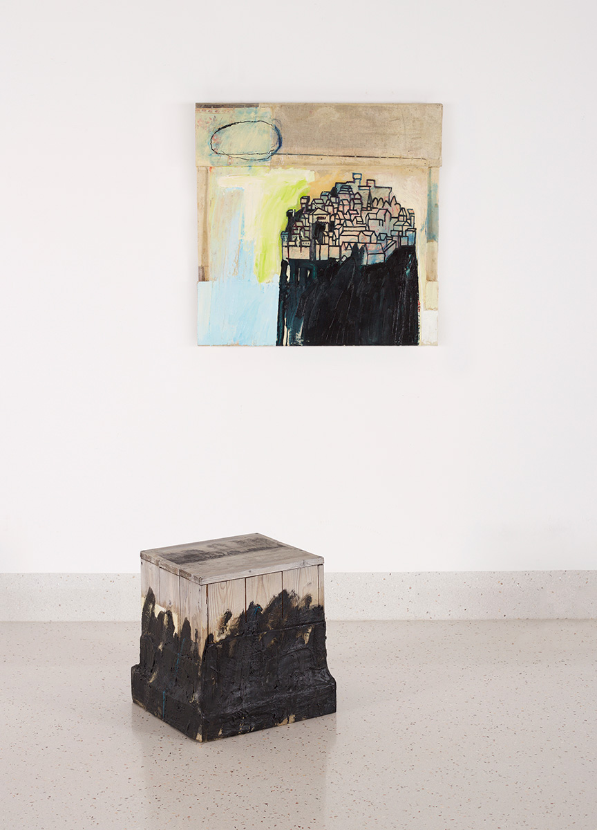 drewno, wosk, olej, płótno (obraz) drewno, len, wosk, olej, transfer fotograficzny na drewnie (obiekt), 80 x 80 x 6 cm (obraz) 45 x 45 x 42 cm (obiekt) sygn. na odwrocie obrazu: WOJCIECH KOPEĆ "MIASTO" 1 z 2 W. Kopeć