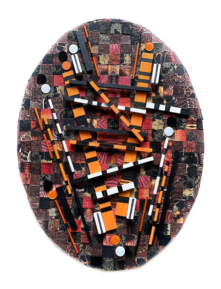 assemblage, tkanina, akryl, płyta HIPS, drewno