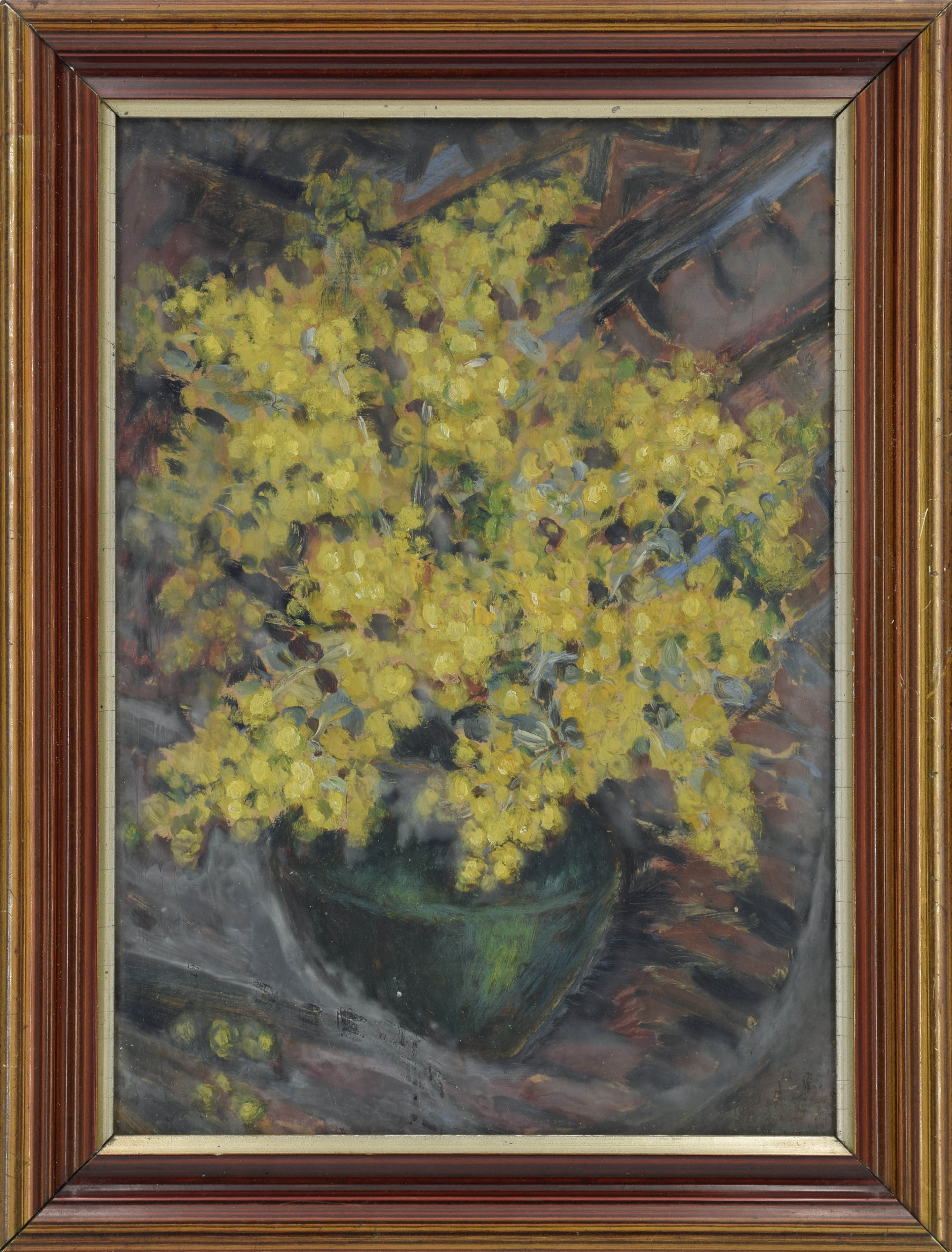 olej, płyta; 33,5 x 23,5 cm (w świetle oprawy); sygn. p. d.: Bron Heyduk; na odwrocie papierowa nalepka Towarzystwa Przyjaciół Sztuk Pięknych w Krakowie z autorem, tytułem: Mimoza i opisem pracy.