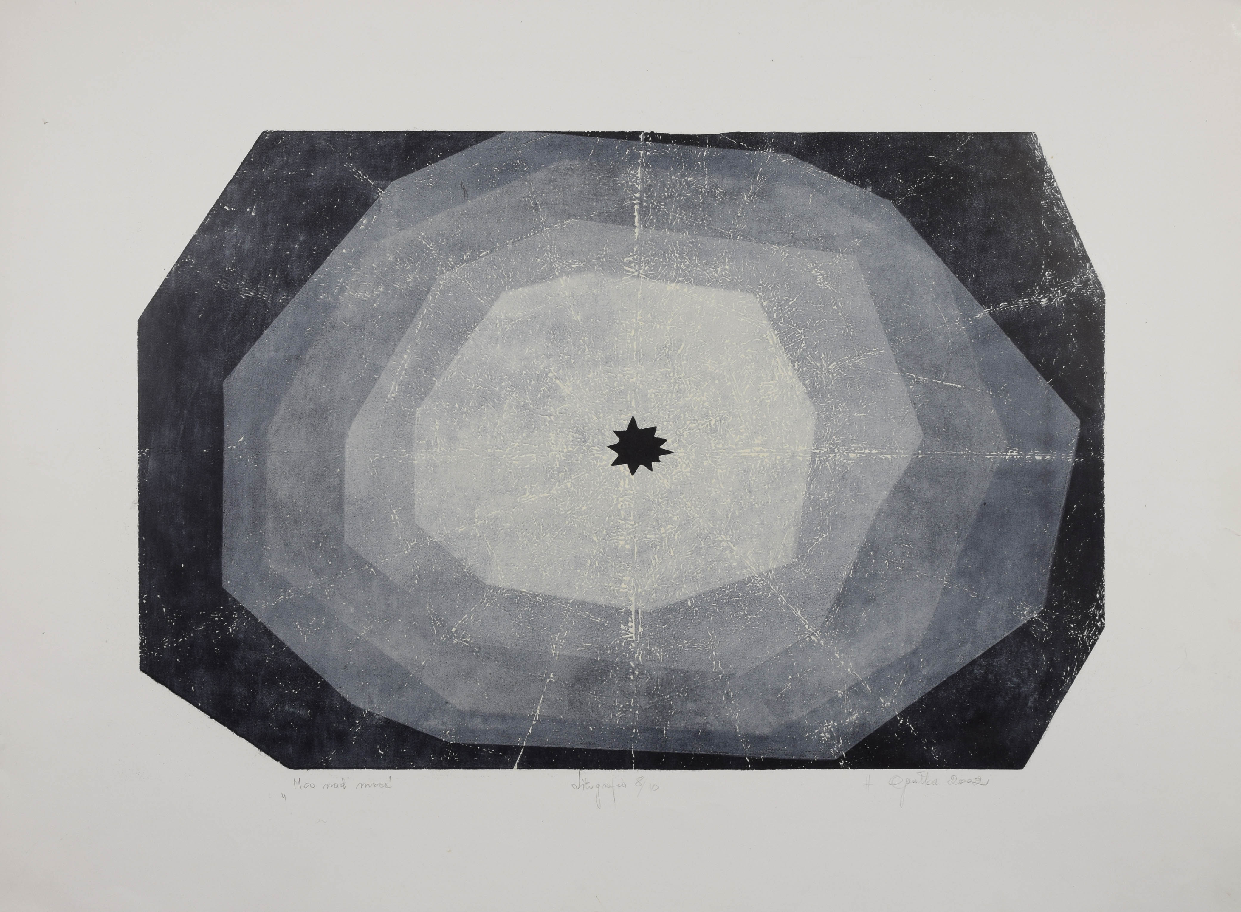litografia, papier; 40 x 59 cm (wymiar kompozycji), 57,5 x 75,5 cm (wymiar arkusza);sygn. dat. i opisana u dołu: "Moc nad moce" / Litografia 8/10 / H Opałka 2002 (ołówkiem).