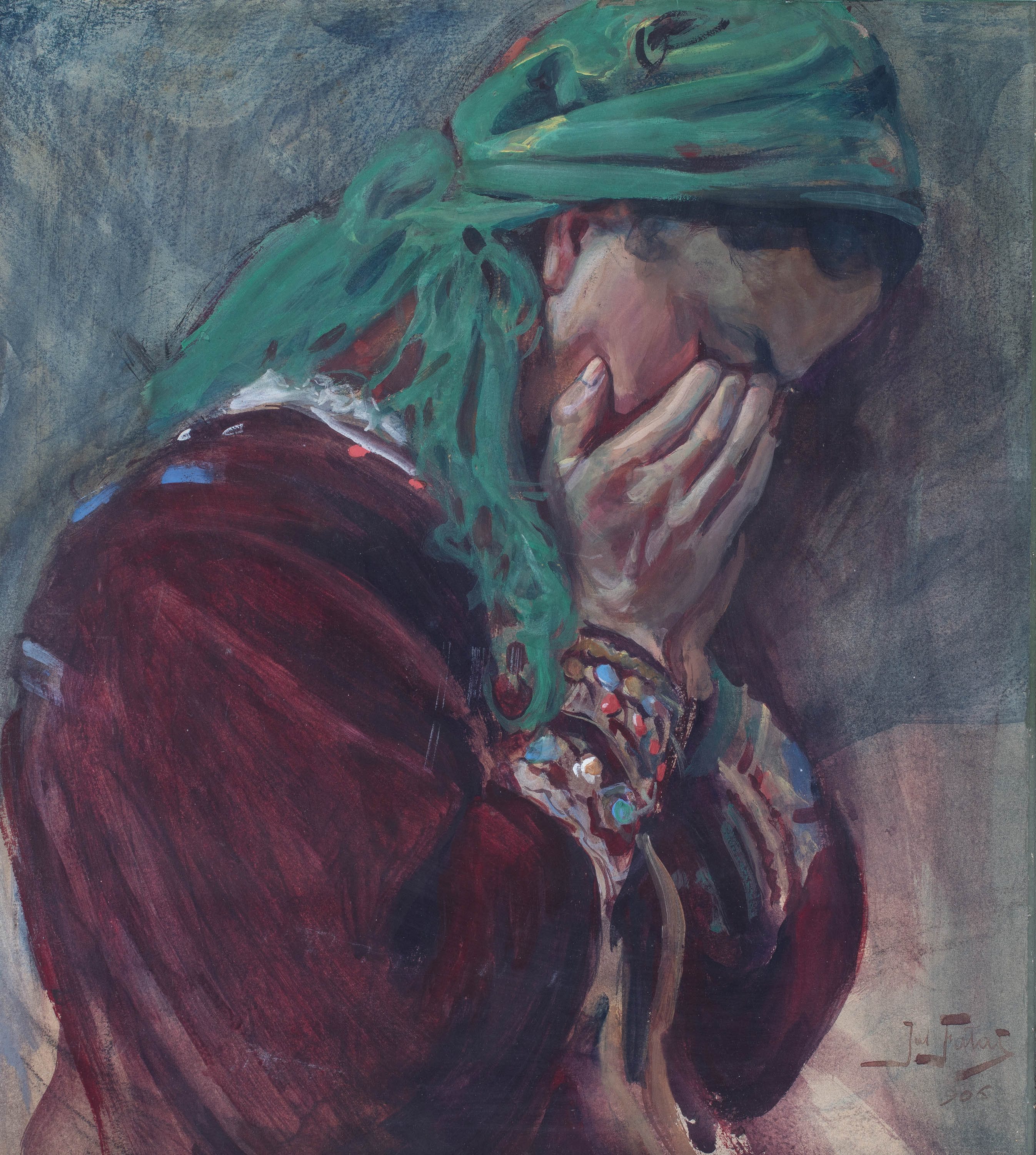 „Julian Fałat był człowiekiem przyjacielskim i otwartym, łatwo nawiązywał kontakty [...] Nie stronił od zawierania znajomości ze zwykłymi ludźmi, swoimi dalszymi i bliższymi sąsiadami. Dowodem serdecznych stosunków i zażyłości artysty z poszczególnymi osobami są licznie reprezentowane w jego spuściźnie portrety. Mają one różny wyraz i formę. Zdecydowana większość wykonana w technice akwarelowej. Jedne z nich są bardzo oficjalne, inne mają charakter dokumentacyjny. Czasem malowane były na pamiątkę spotkania, w podziękowaniu za jakąś przysługę czy okazaną pomoc.” (Julian Fałat – życiorys pędzlem malowany, red. I. Purzycka, Bielsko-Biała 2017, s. 55) Sami portretowani wielokrotnie wyrażali pochlebne opinie o pracach Fałata. „Właśnie otrzymałem oba portrety i pański łaskawy list, oba są cudownej roboty, w pełni godnej Mistrza, […] w żadnych okolicznościach nie wypuszczę tych obrazów z ręki, wiem przecież ile kosztowały Pana wiele wysiłku i pracy, a ja nie tylko, że jestem całkowicie zadowolony, ale także przekazuję Panu moje serdeczne, gorące podziękowanie za jego dobroć i uprzejmość – napisał z Berlina Carl Bechstein. (List C. Bechsteina do J. Fałata, 13 lipca 1892, MBB/H- -F/2228, tłum. P. Kenig) Prezentowana praca Juliana Fałata przedstawia kobietę ujętą w półprofilu, pogrążoną w zadumie i duchowej introspekcji. Postać skrywa twarz w dłoniach, pozostawiając niedopowiedzenie odnośnie swojego nastroju. Być może płacze i owym gestem ukrywa spływające po rumianych policzkach łzy. Zielona chusta okrywająca włosy kontrastuje z głębokimi tonami bordo i brązów stroju. Tło utrzymane w chłodnych szarościach stanowi neutralną przestrzeń wydobywając sylwetkę i emocjonalny wyraz kompozycji. „Mistrzem trzeba aby być nie lada, z chaotycznego na pozór zmieszania plam i plamek różnobarwnych wydobyć twarz ludzką żywą, uduchowioną, pełną wyrazu właściwego i temperamentowej odrębności.” (Wiktor Gomulicki cytowany w: Julian Fałat, Stalowa Wola 2010, s. 130) „Wszystkie utwory Juliana Fałata charakteryzuje przede wszystkim nadzwyczajna siła wyrazu i prawda realistyczna, wolna jednak od wszelkiej przesady naturalistycznej, od chęci drażnienia wyobraźni stroną ujemną rzeczywistości.” (Henryk Struve, „Kłosy”, 1888)