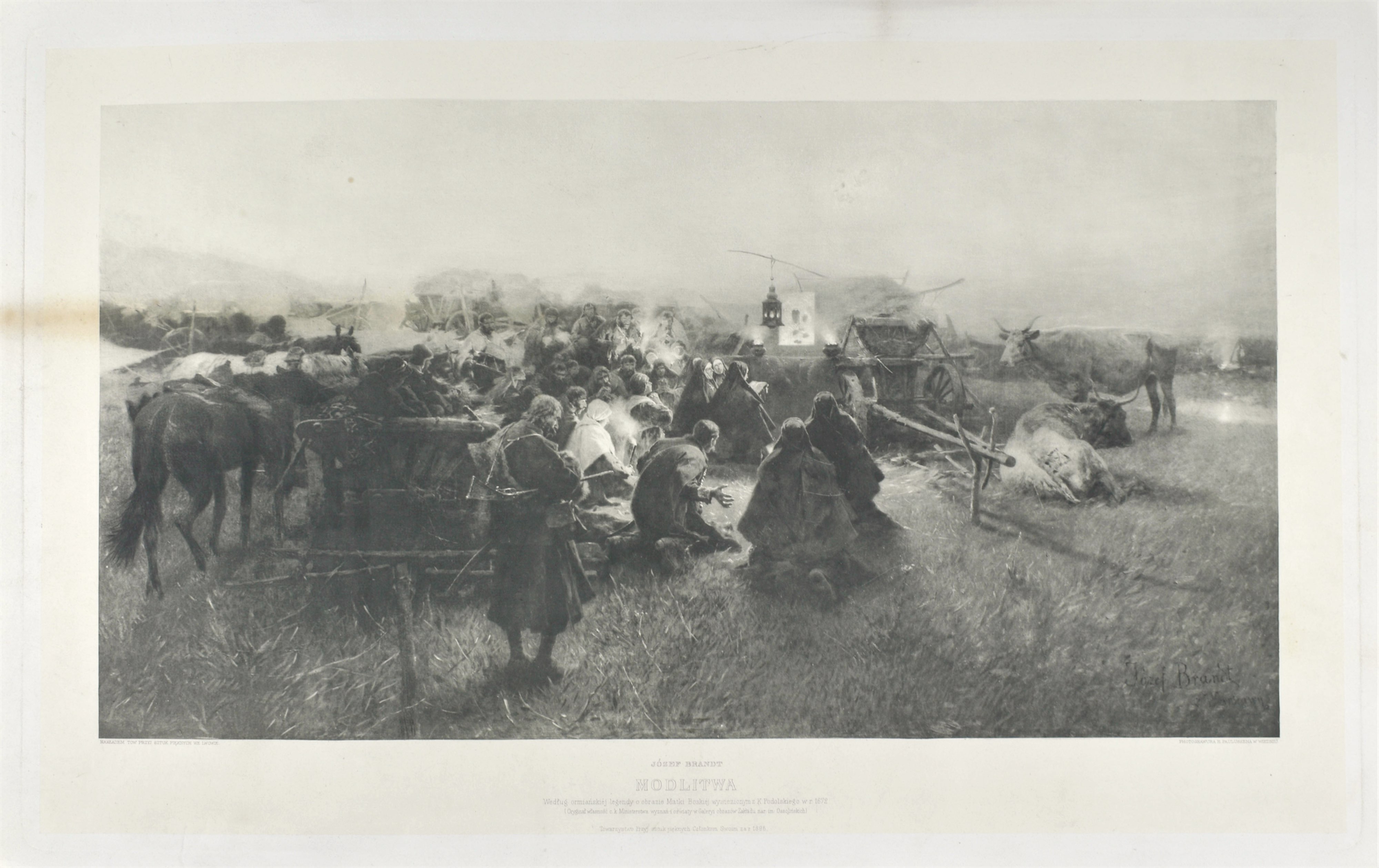napis pośrodku u dołu: JÓZEF BRANDT / MODLITWA / Według ormiańskiej legendy o obrazie Matki Boskiej wywiezionym z K. Podolskiego w r. 1672 / (Oryginał własność c.k. Ministerstwa wyznań i oświaty w Galeryi obrazów Zakładu nar. Im. Ossolińskich) / Towarzystwo Przyj. sztuk pięknych Członkom Swoim za r. 1896. (drukiem); napis p. d.: PHOTOGRAWURA R. PAULUSSENA W WIEDNIU. (drukiem); napis l. d.: NAKŁADEM TOW. PRZYJ. SZTUK PIĘKNYCH WE LWOWIE. (drukiem)