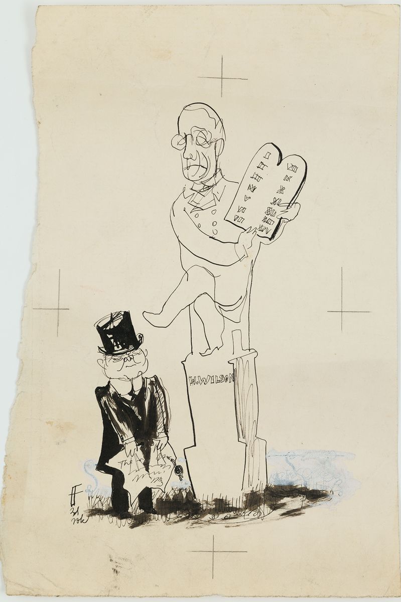 Rysunek przedstawia prezydenta USA Hoovera drącego traktat wersalski pod pomnikiem prezydenta Wilsona trzymającego tablice z 14 punktami jego programu pokojowego z 1918 r. Ów program był podsatwa dla traktatu wersalskiego ustalający ład po I wojnie światowej. Hoover w 1931 r. ogłosił moratorium, które było demontażem traktatu wersalskiego.