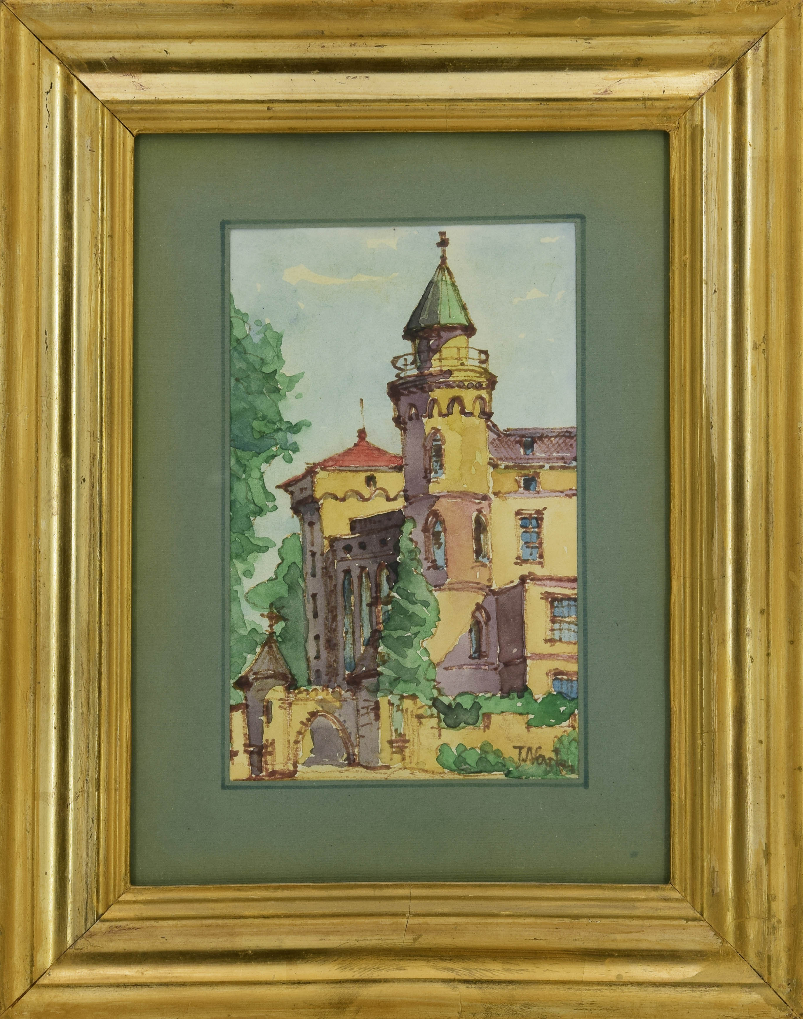 rysunek flamastrem podmalowany akwarela, papier; 20 x 12 cm (w świetle passe-partout); sygn. p. d.: TNartowski (ołówkiem, częściowo pod ramą); na odwrocie oprawy napis: Nartowski Tadeusz / „Architektura pałacowa” (piórem).