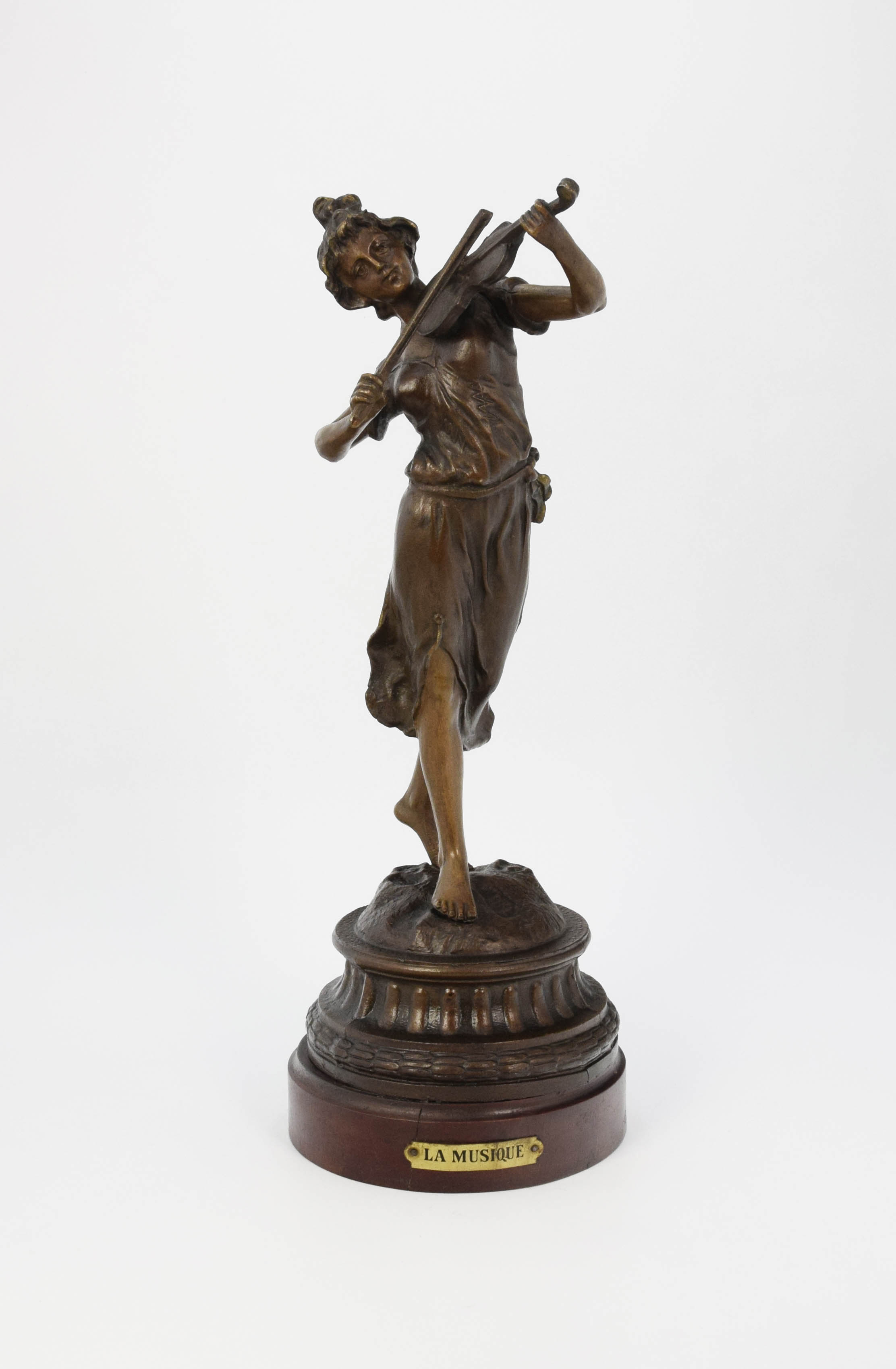 Figura młodej kobiety, bosej, w fałdzistych szatkach, kroczącej z wdziękiem i grającej na skrzypcach. Cokół toczony w drewnie, opatrzony od frontu mosiężną tabliczką z napisem: „LA MUSIQUE”.