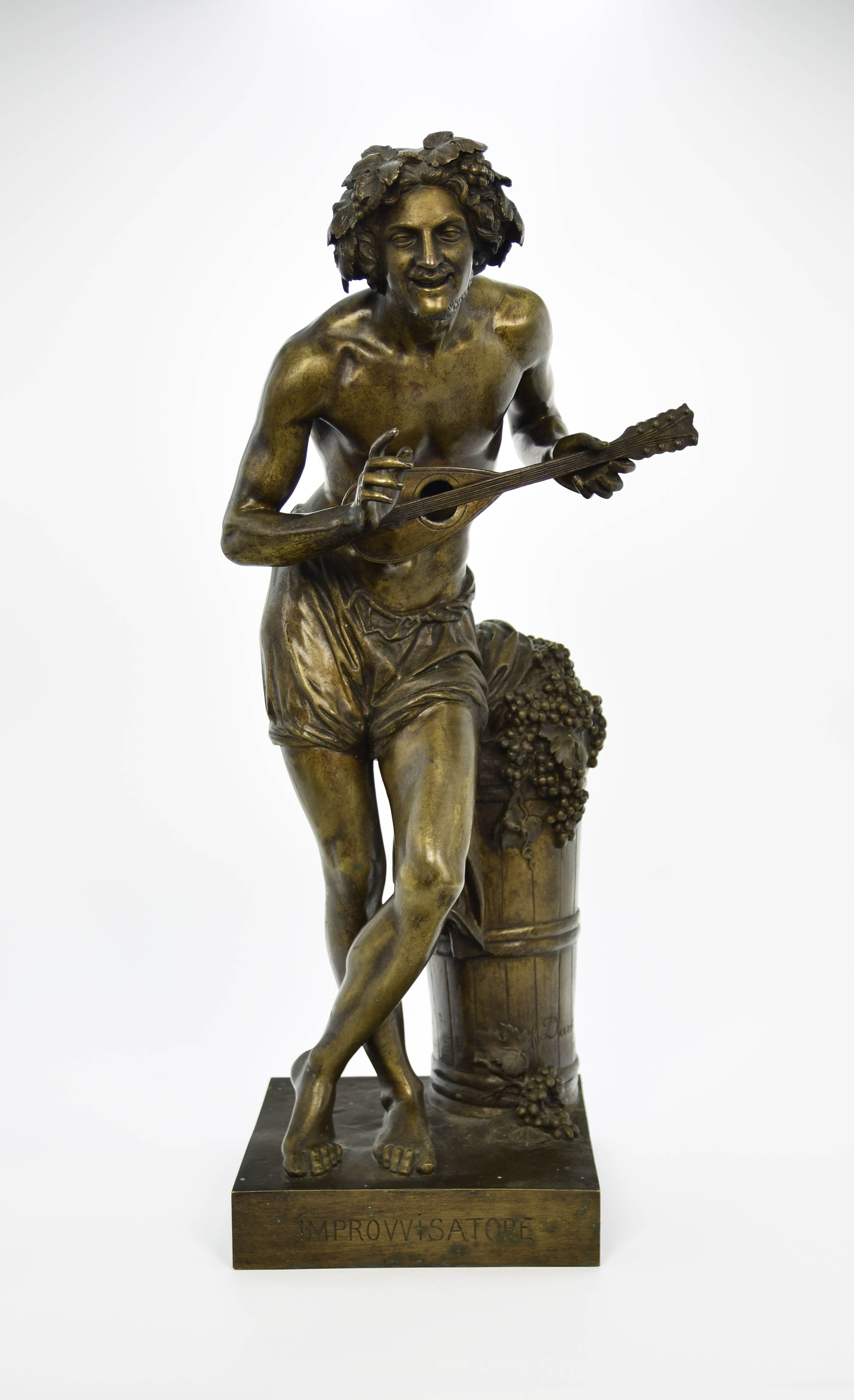 Figura uśmiechniętego, półnagiego bożka grającego na mandolinie, stojącego ze skrzyżowanymi nogami przy kolumnie, na której umieszczona płachta wypełniona gronami winnej latorośli. Z przodu na podstawie napis: „IMPROVVISATORE”. Sygn. z boku na kolumnie: „Duret”.