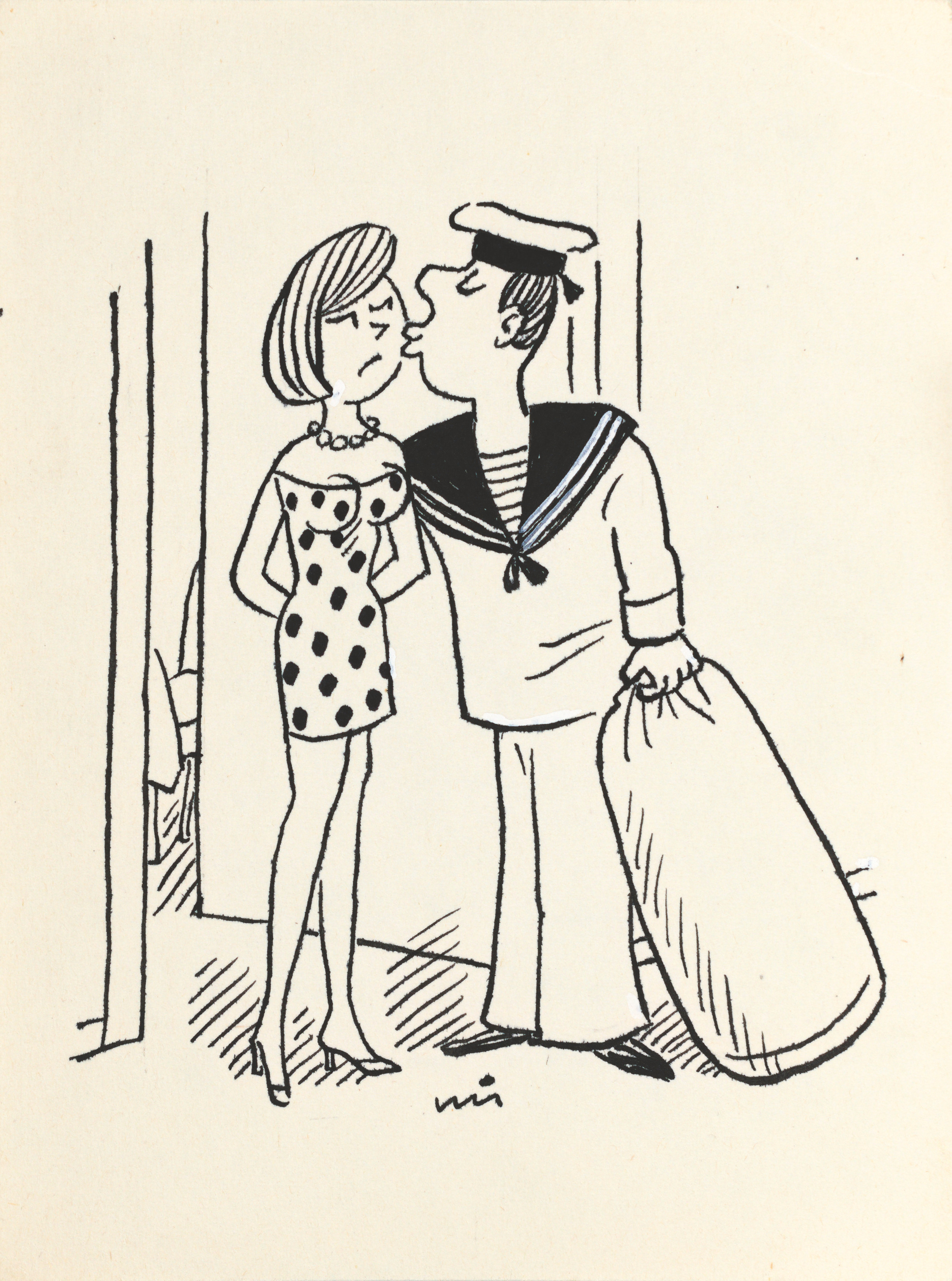 tusz, biała farba, papier; 17,8 x 13,1 cm; sygn. śr. d.: mi. Opisany autorsko na odwrocie: L - Na mnie czas! Do widzenia Zosiu!!! Przepraszam…Marysiu!!!Chciałem powiedzieć Kasiu!!!