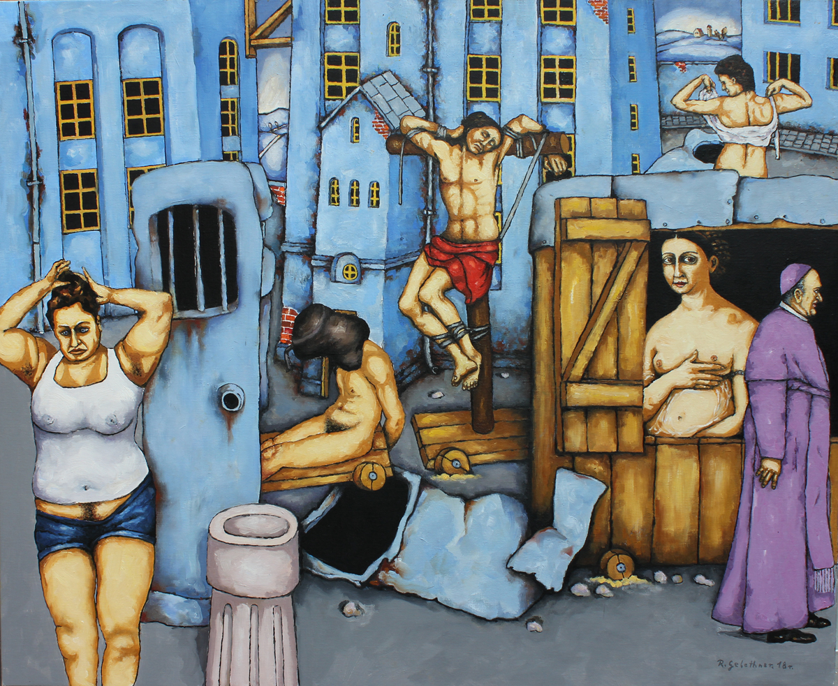 olej/płótno, 90 x 110 cm,sygnowany, datowany, opisany na odwrociu: 'ROBERT GEBETHNER | 2018 r. | tyt. - „NA PODWÓRKU" | 90 x 110 cm. - OLEJ'