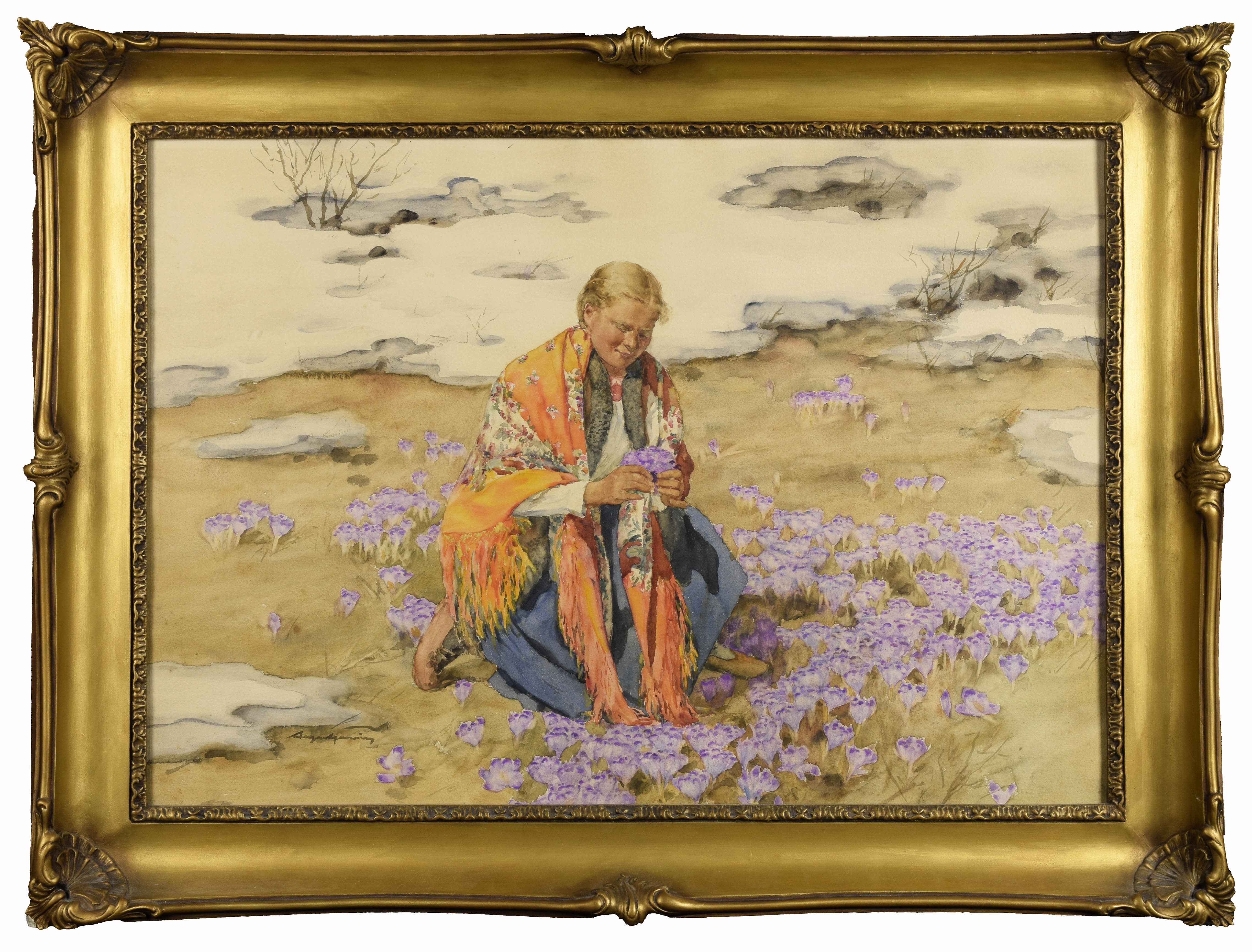 akwarela, papier; 54 x 73 cm;sygn. l. d.: Augustynowicz;na odwrocie oprawy, dwa transfery nalepek z autorem i tytułem obrazu: Kogut / Lonia Strychowska (?) / Przy studni.