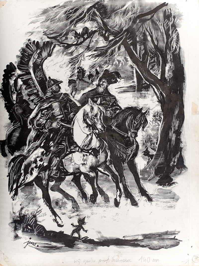 Projekt ilustracji do książki Hanny Januszewskiej "Rękopis pani Fabulickiej", wyd. Nasza Księgarnia, Warszawa 1958