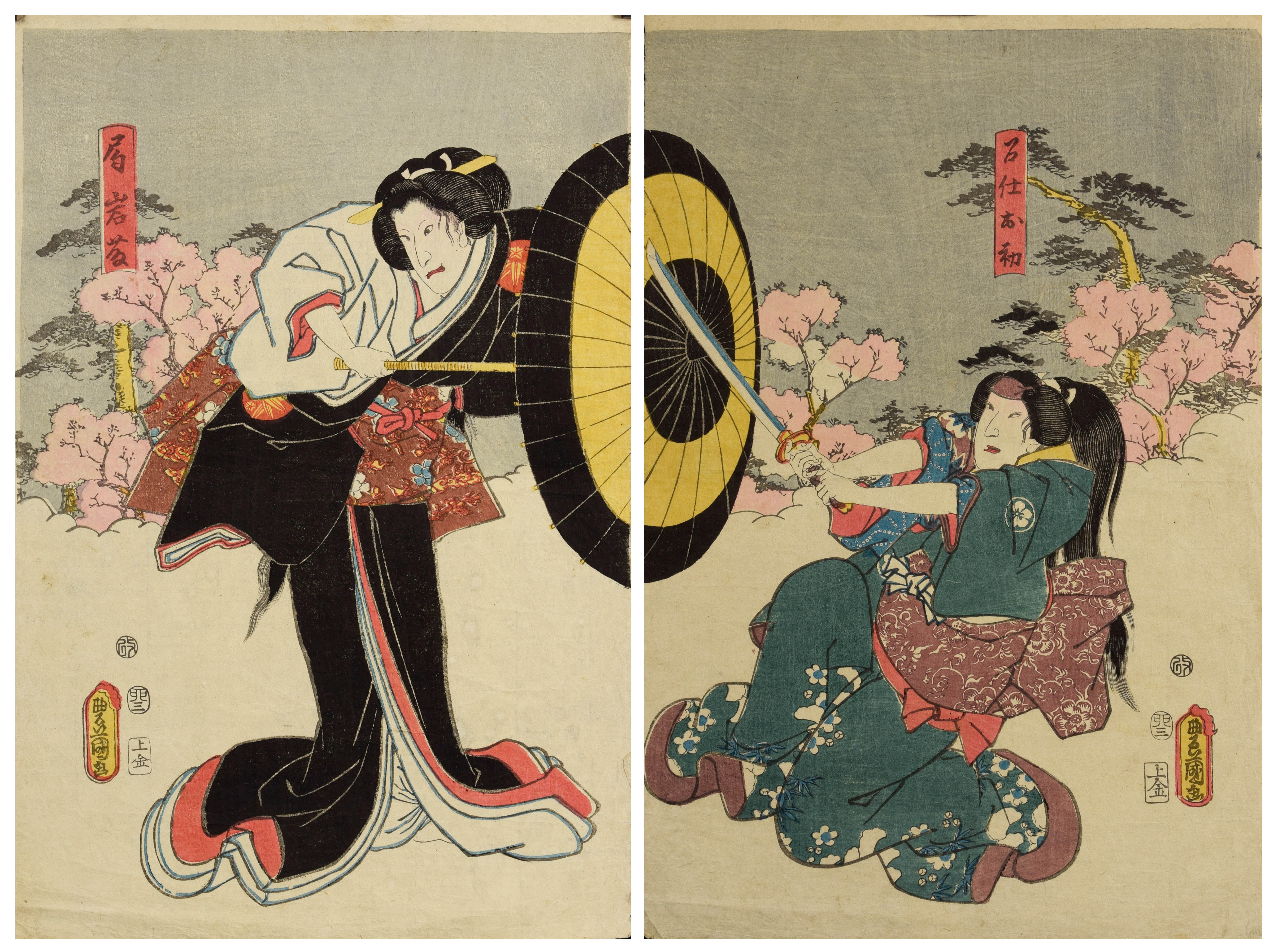 Aktorzy kabuki Bando Hikosaburo V (p.) i Sawamura Tanosuke III (l.) jako Asojiro i Miyuki w sztuce "Tsuyu no Hinuma Asagao Nikki" drzeworyt barwny, papier; 2 plansze: 37 x 25 cm (każda); Wydawca: Ise-kane, 1863.