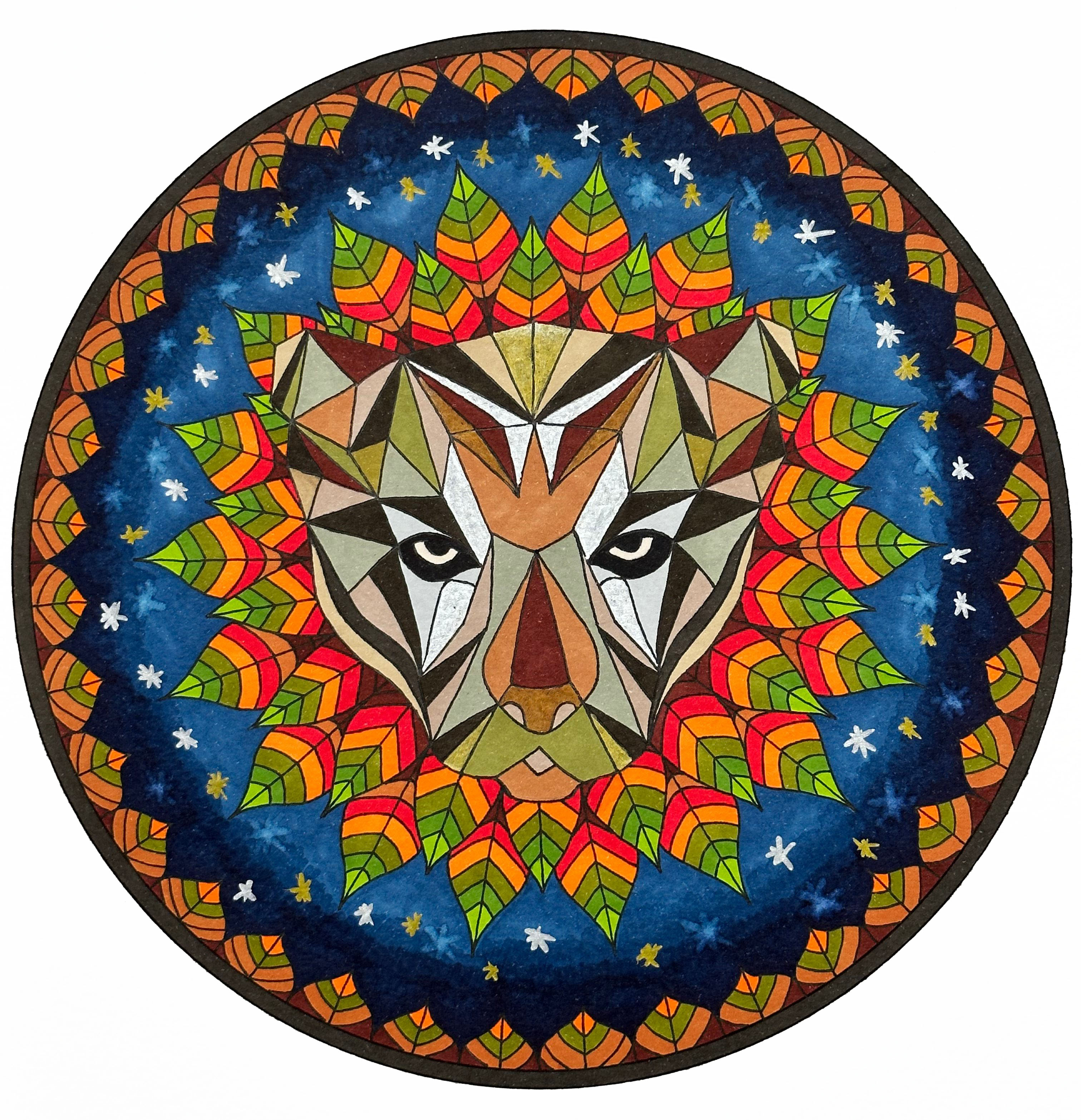 technika mieszana (kolorowe markery + czarny cienkopis), papier (gr. 250), śr. 19 cm;sygnowana, datowana i opisana z przodu oraz na odwrocieoprawiona (wymiary z oprawą 32.5 x 32.5 cm)