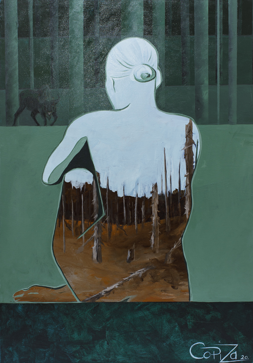 akryl, płótno, 100 x 70 cm,sygn.p.d.: CoPiZa 20,opisany na odwrocie: Izabela Dąbrowska "Nagie obrazy lasu - wiosna"