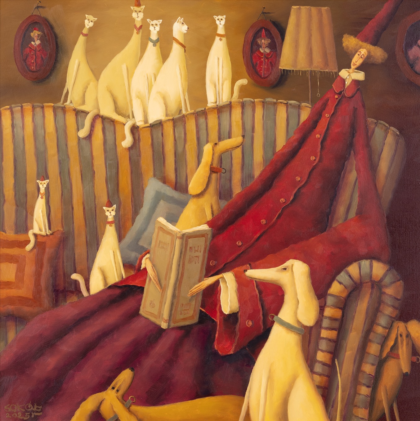 olej, płótno, 80 x 80 cm (w oprawie 113,5 x 113,5 cm), sygnowany l.d.: 'SOKÓŁ | 2025 r.' oraz opisany na odwrocie: '"NAJMILSZE JEDNAK ZE | WSZYSTKIEGO, TO POWRÓT | DO DOMU – POWIEDZIAŁA ANNA" | LESZEK SOKÓŁ / 2025 | WYM: 80 x 80'