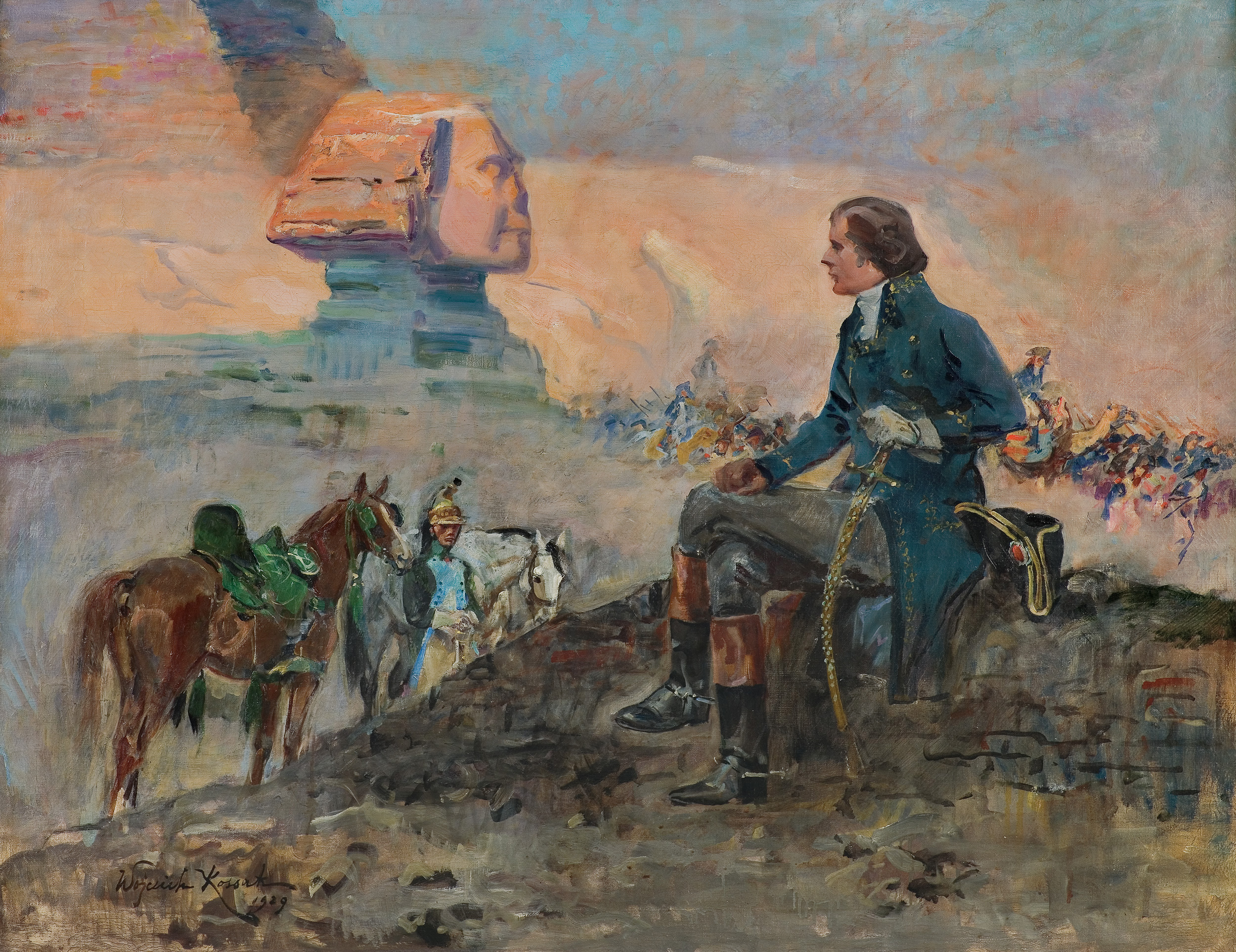 Wojciech Kossak (Paryż 1856 - Kraków 1942 ) – powszechnie znany malarz, postrzegany przede wszystkim jako świetny batalista. Syn i uczeń Juliusza Kossaka kształcił się w krakowskiej Szkole Sztuk Pięknych, w Akademii monachijskiej oraz w Paryżu. W latach 1895-1902 przebywał głównie w Berlinie, pracując dla cesarza Wilhelma II. Wiele podróżował, m.in. do Hiszpanii i Egiptu, gdzie wykonywał szkice do zamierzonych panoram. W późniejszych latach kilkakrotnie wyjeżdżał do Stanów Zjednoczonych wykonując zamówienia portretowe. W 1913 był mianowany profesorem warszawskiej Szkoły Sztuk Pięknych. W latach I wojny światowej pełnił służbę wojskową. Był współautorem panoram: „Racławice” (1893-1894), „Berezyna” (1895-1896), „Bitwa pod piramidami” (1901) oraz szkiców do niezrealizowanej „Somosierry” (1900). Z temperamentem i swobodą tworzył szeroko malowane, dynamiczne sceny batalistyczne, historyczne, rodzajowe oraz liczne portrety. Z upodobaniem malował konie. Jego obrazy, gloryfikujące dawne i współczesne artyście polskie wojsko i bohaterstwo żołnierzy, trafiały do patriotycznych uczuć odbiorców i cieszyły się ogromna popularnością.
