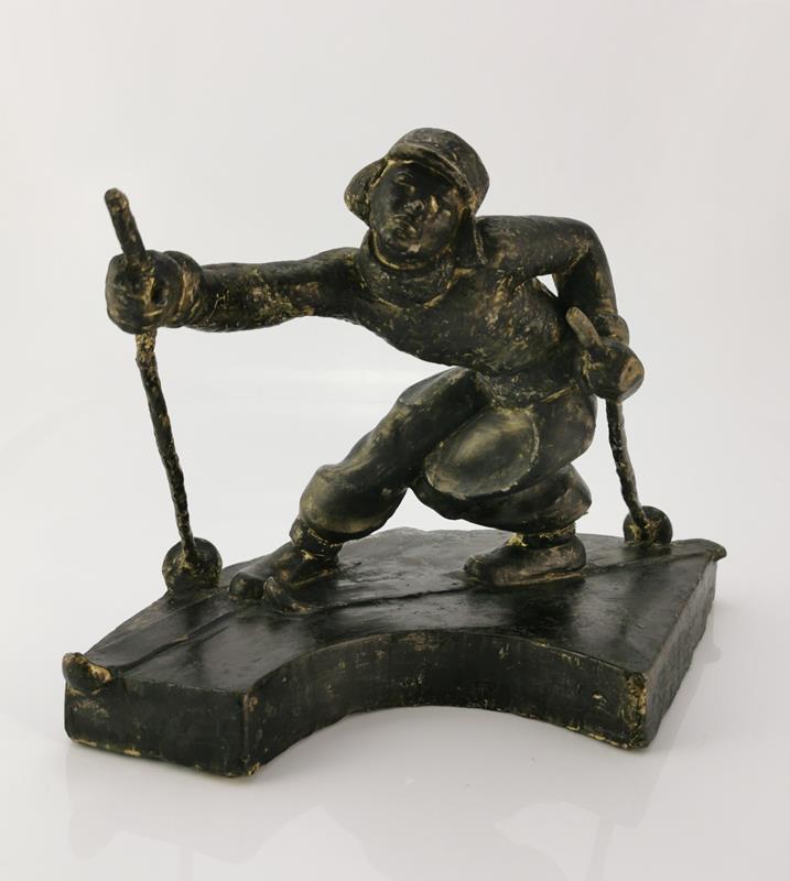 Postać chłopaka wykonującego skręt na nartach. Podstawa łukowata. Całość pokryta czarną farbą.