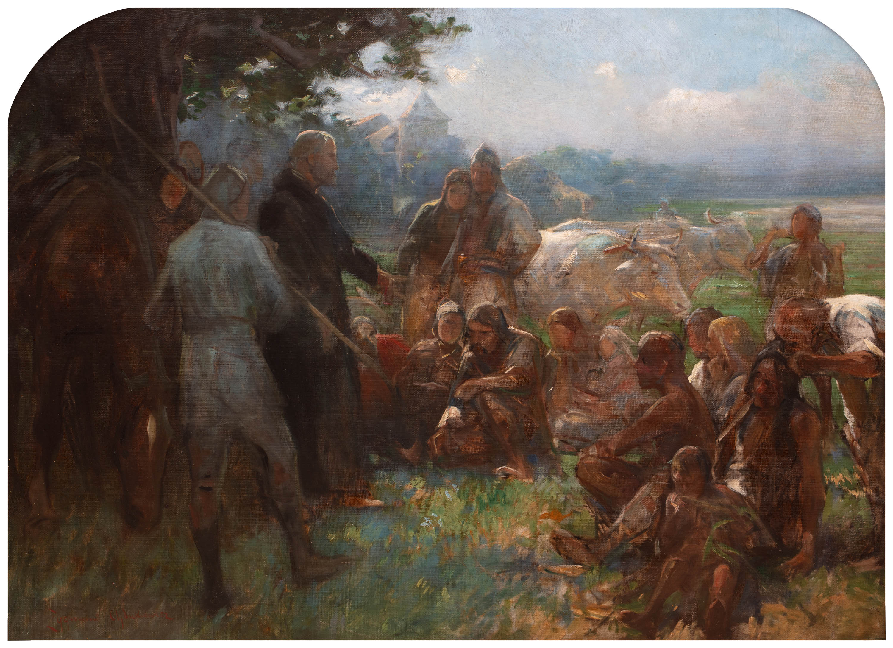 na odwrocie napis: Autentyczność szkicu/ Zygmunta Ajdukiewicza/stwierdzam/ Stan. Ajdukiewicz; do blejtramu i płótna przyklejone orzeczenie dr Kazimierza Buczkowskiego o autentyczności z 1946 r., określające temat obrazu jako scenę „nawracania Węgrów na wiarę chrześcijańską przez św. Szczepana(975–1038)”