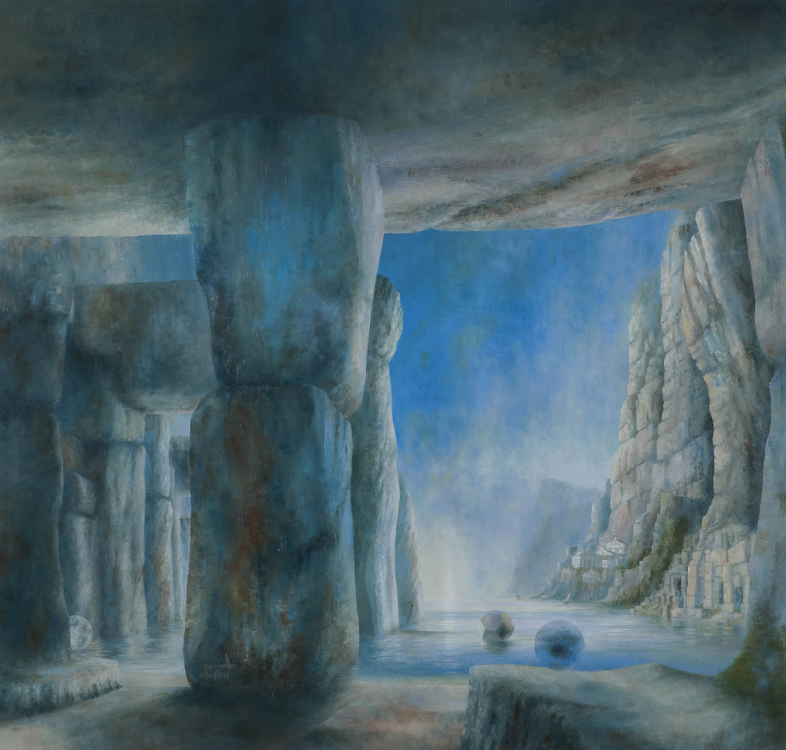 olej, płyta95 x 100 cmsygn. l.d. na kolumnie: AM [monogram wiązany]sygn. na odwr.: Neolythic Biforium | A. Maląg 03.2023. | AM [monogram wiązany] [nieczytelne]