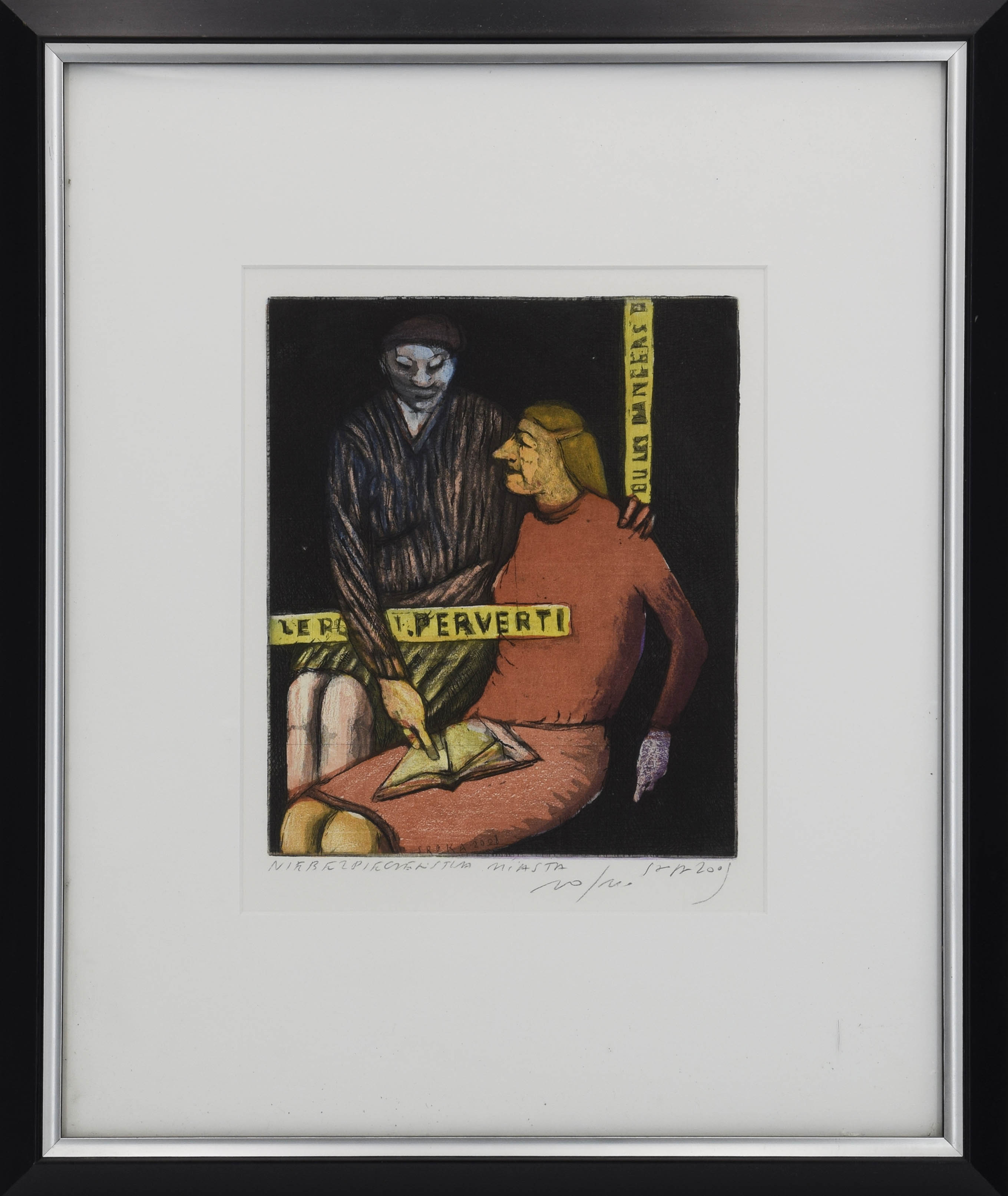 akwaforta, akwatinta barwna, papier; 25 x 20,5 cm (odcisk płyty), 28,5 x 23 cm (wymiar arkusza w świetle oprawy);tytuł l. d.: NIEBEZPIECZEŃSTWA MIASTA (ołówkiem); sygn. i dat. p. d.: Sroka 2009 (ołówkiem); poniżej nr odbitki: 10/100 (ołówkiem).