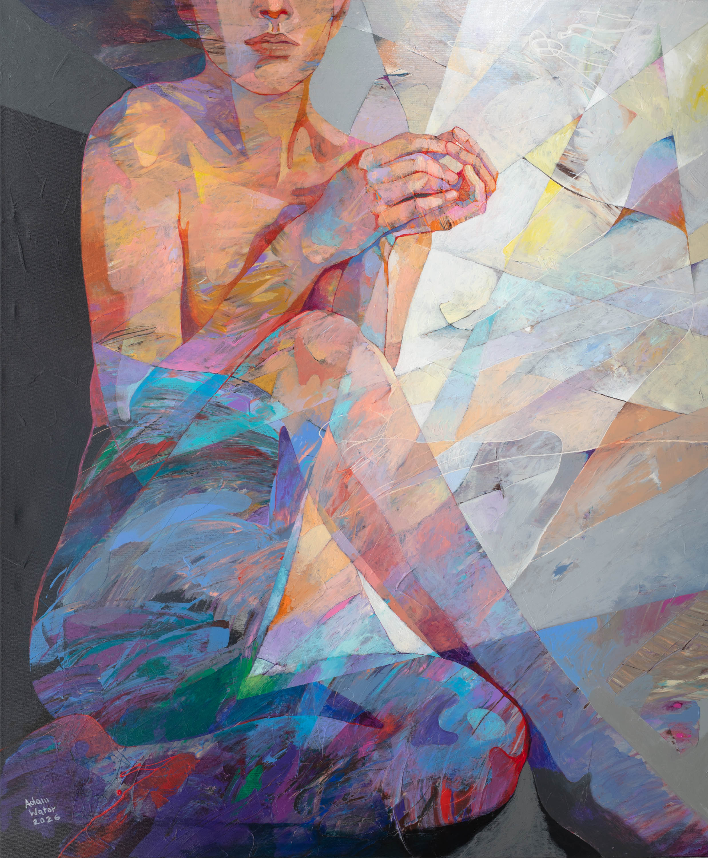 akryl, płótno, 120 x 100 cm,sygnowany l. d.: "Adam Wątor | 2026 oraz opisany na odwrocie: NIEPEWNOŚĆ | ADAM WĄTOR | 2025"