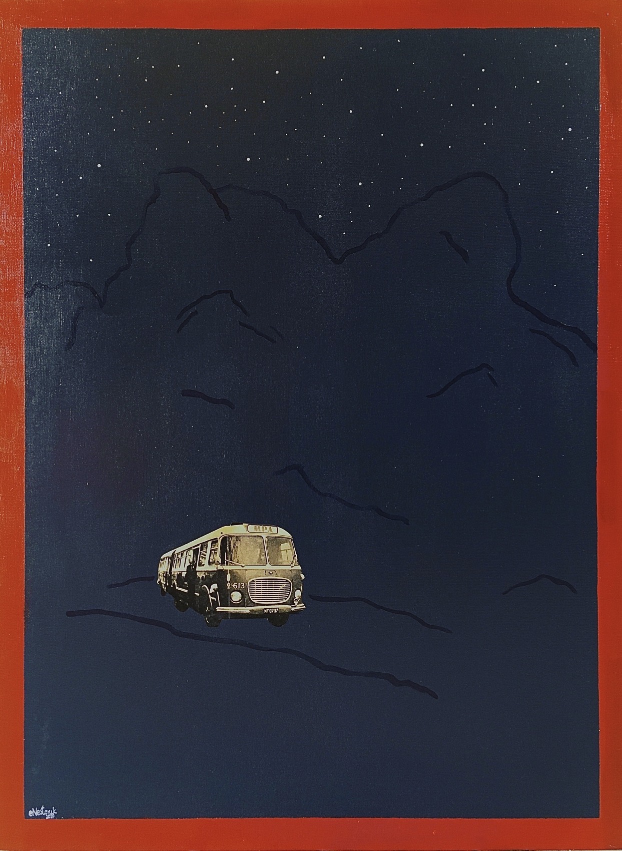 technika mieszana, akryl, kolaż, werniks błyszczący/płótno, 80 x 60 cmsygnowany l.d.: "ENesteruk/ 2020"