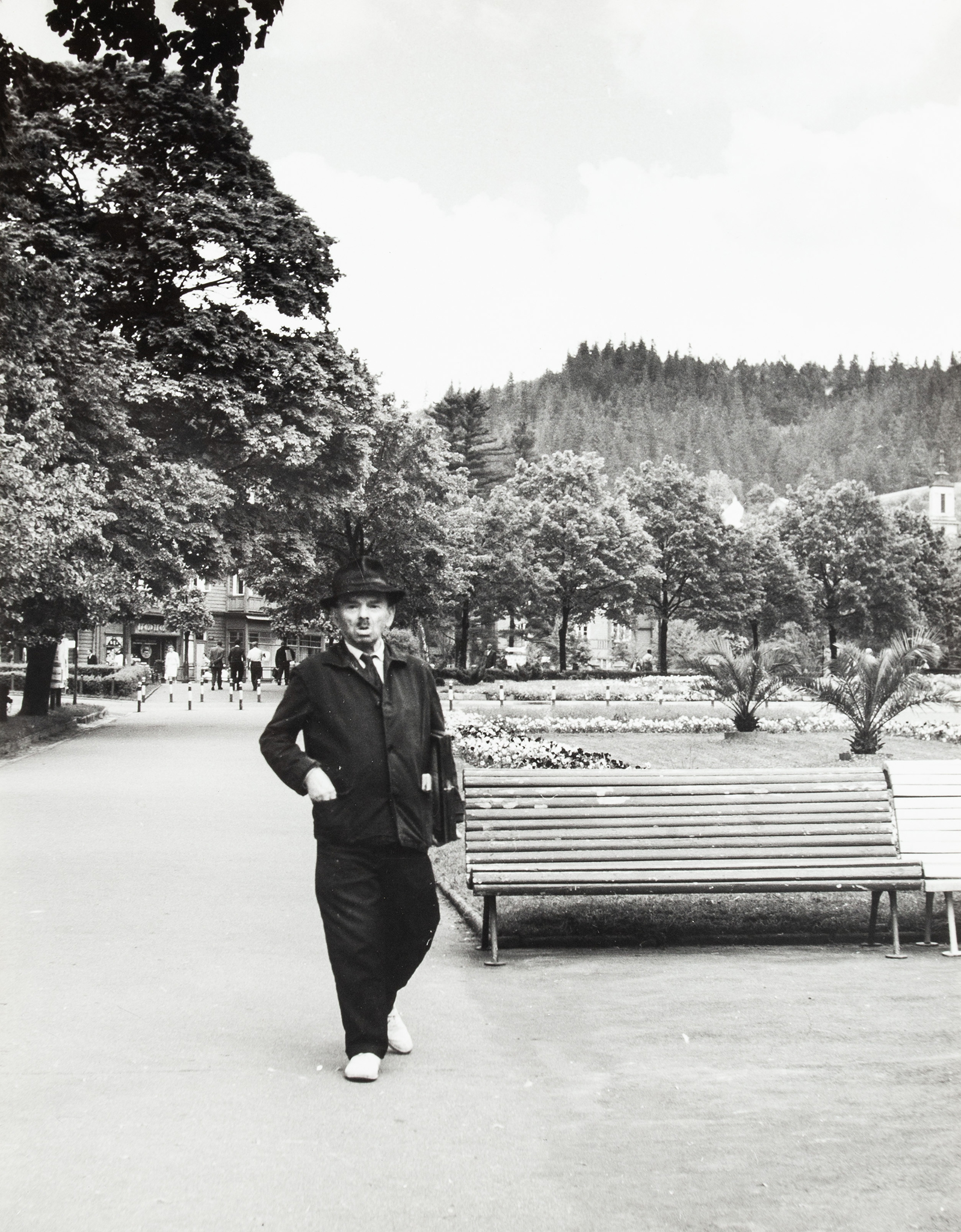 Fotografia czarno-biała, 23 x 18 cm.Na odwrocie opis ołówkiem: "Herr Nikifor, im Park von | Krynica promenierend, 1963".