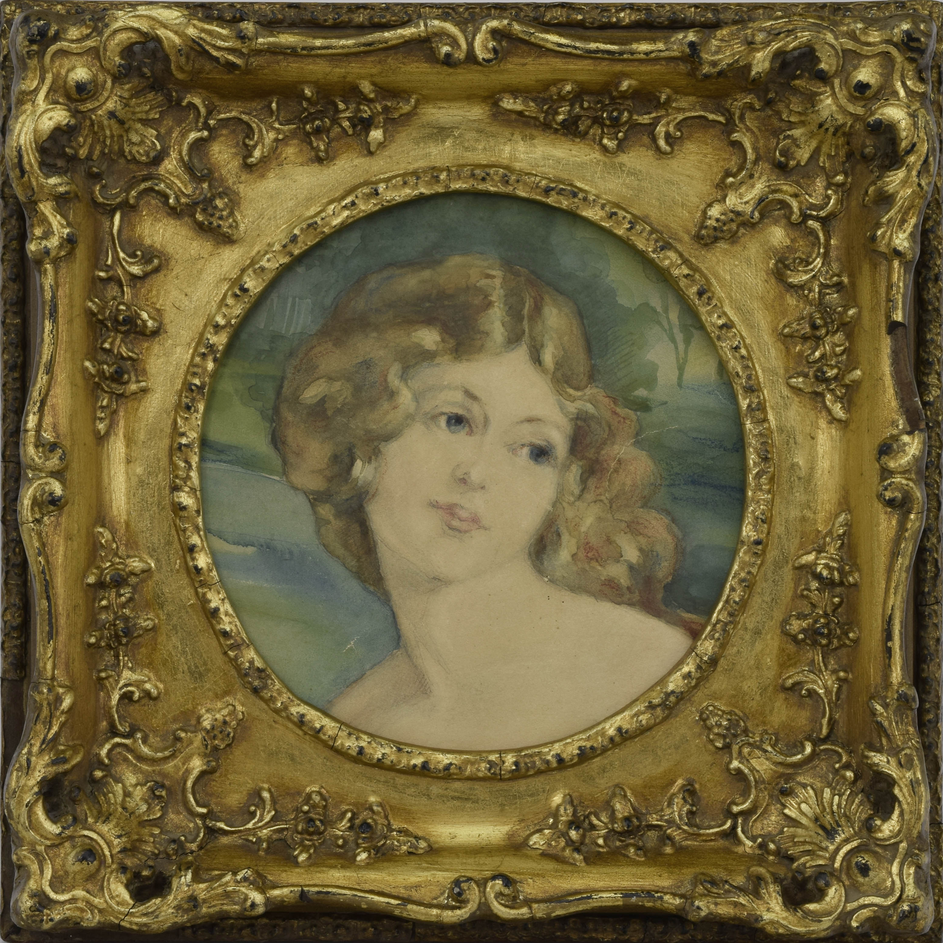 akwarela na podrysowaniu ołówkiem, kredka; 18 x 18 cm (w świetle oprawy);sygn. na odwrocie: Mrozińska 1887 r.-?.Ślady naprawy papieru.