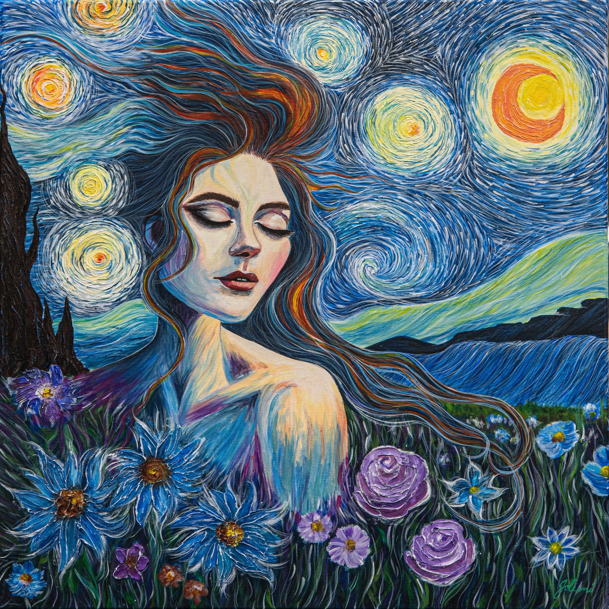 . W swojej twórczości łączy naturę, emocje i duchowość, poszukując harmonii pomiędzy światem zewnętrznym a wewnętrznym. W procesie twórczym chętnie sięga po techniki mixed media, traktując powierzchnię płótna jako przestrzeń do odkrywania i tworzenia nowych form wyrazu. Inspiracje czerpie z przyrody, kosmosu oraz duchowego wymiaru istnienia. Każdy obraz jest dla niej formą medytacji — zaproszeniem do wewnętrznej podróży, w której odbiorca może odnaleźć ciszę, równowagę i poczucie połączenia z czymś większym. Jej celem jest tworzenie sztuki, która nie tylko zdobi, lecz także wpływa na emocje i atmosferę przestrzeni, wnosząc w nią światło, spokój i refleksję.