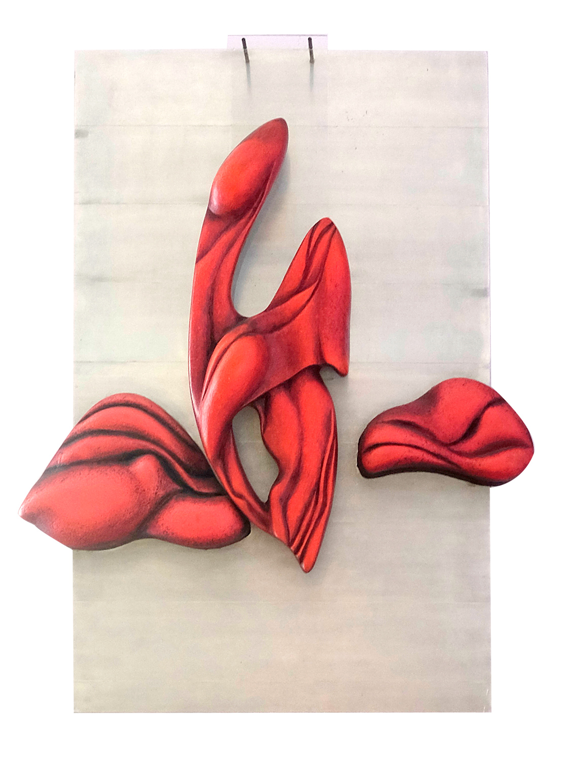 technika własna, płyta pilśniowa, drewno, akryl, pleksi, elementy metalowe; 80 x 50 cm (podobrazie), 80 x 60 x 20 cm (całość); na odwrocie nalepka wystawowa BWA Katowice z autorem, tytułem, techniką i czasem powstania.