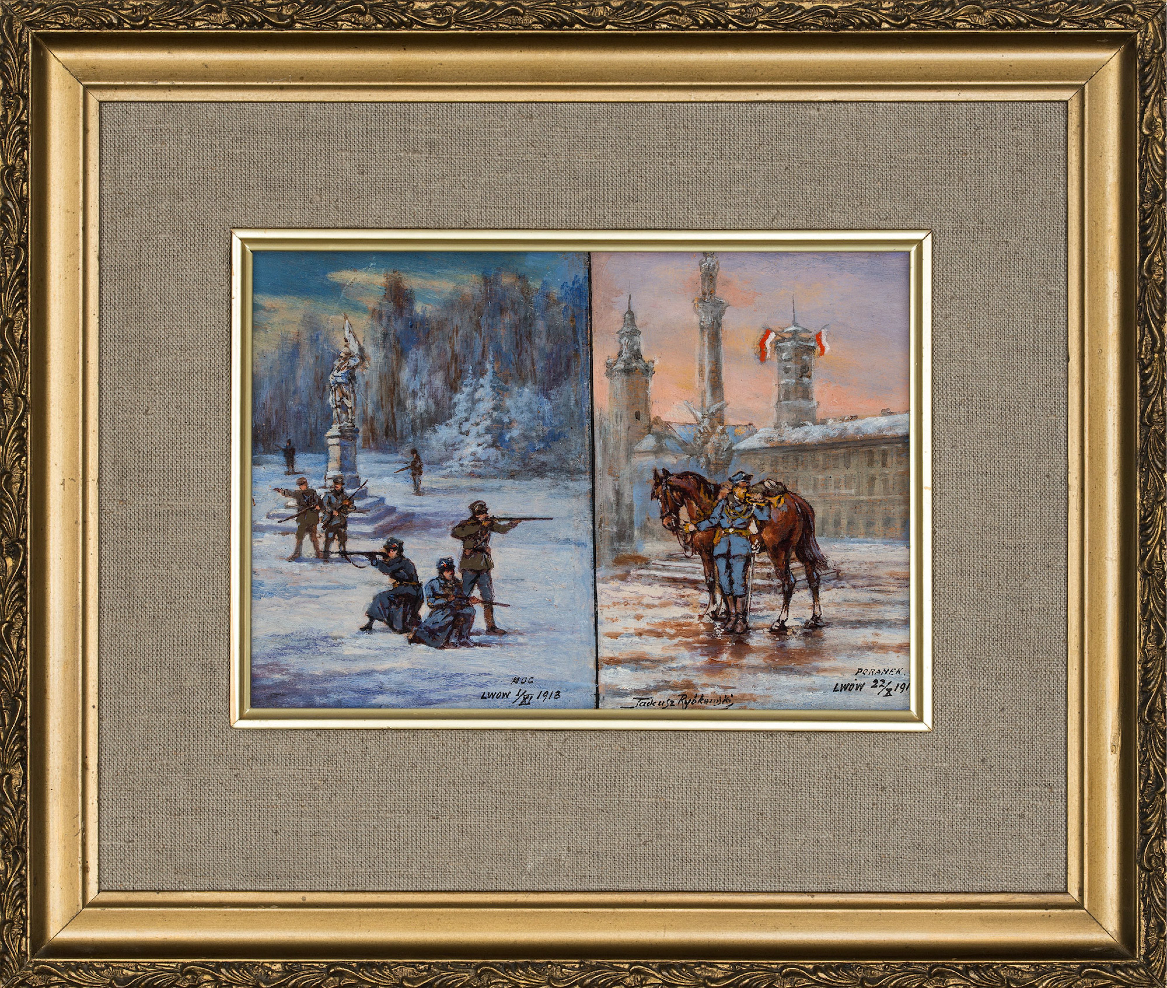 olej na tekturze, 1918 rok, 17 x 24 cm, sygnowany w lewym, dolnym rogu prawej kompozycji: "Tadeusz Rybkowski". Lewa praca datowana i opisana w prawym, dolnym rogu: "NOC | LWÓW 1/XI 1918", prawa: "PORANEK. | LWÓW 22/X 1918".
