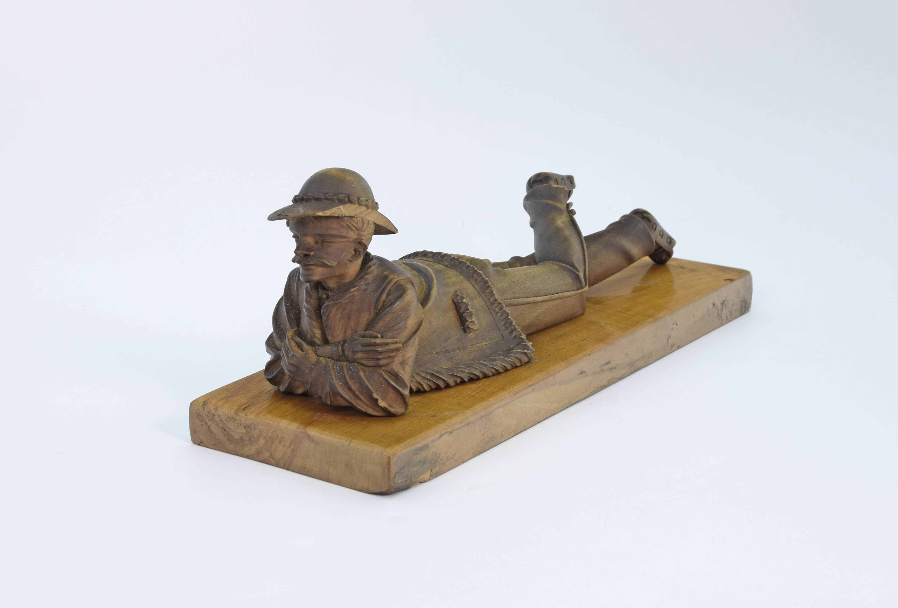 Przedstawienie leżącego na brzuchu górala w tradycyjnym stroju wspartego na zgiętych przedramionach i przebierającego nogami w powietrzu.