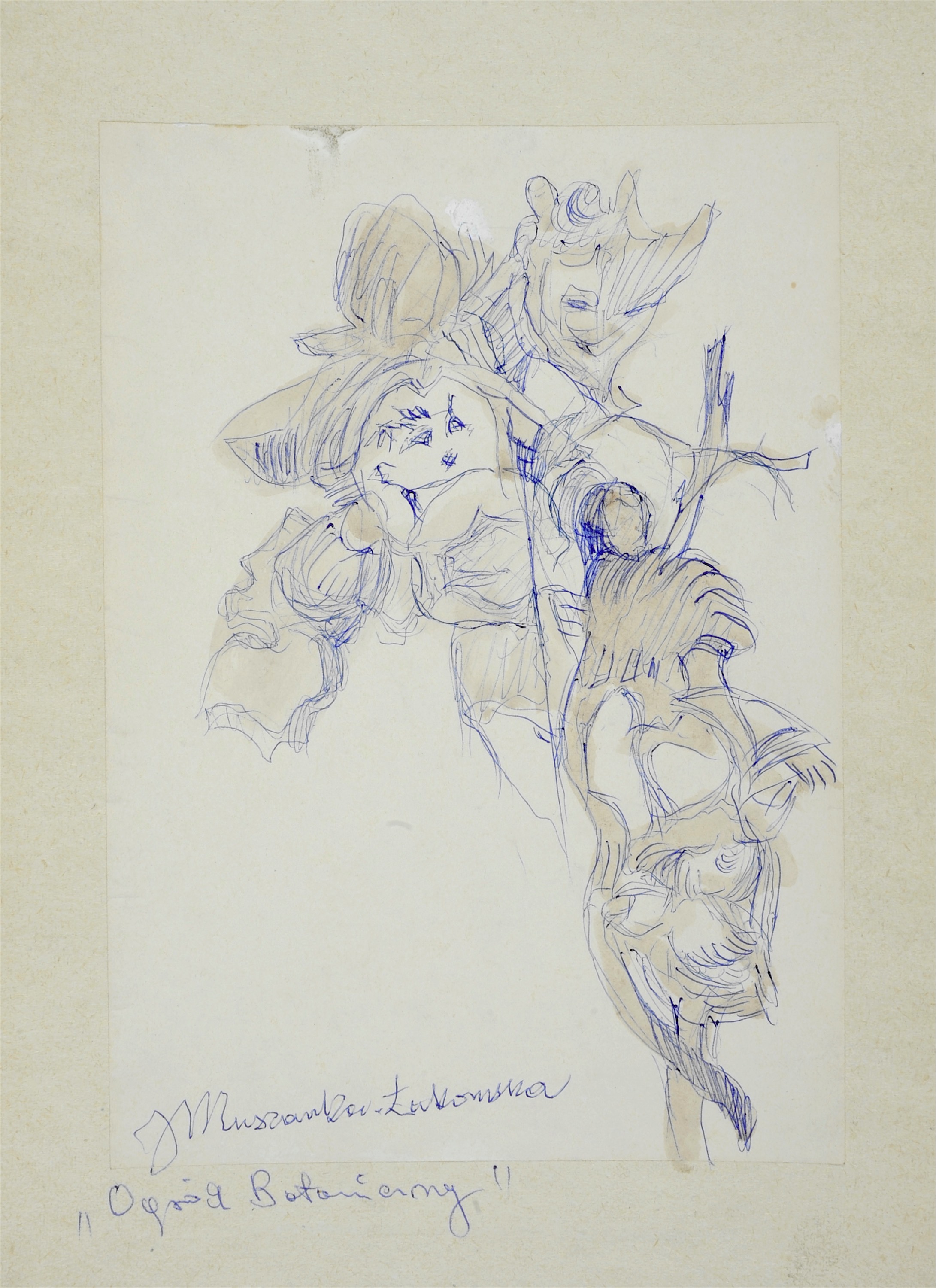 długopis niebieski, tusz lawowany; papier; 21 x 15 cm; naklejony na karton 29,5 x 21 cm; sygnowany u dołu z lewej JMuszanka - Łakomska; poniżej obrazu z lewej napis autorski długopisem „Ogród Botaniczny” . Praca pochodzi ze spuścizny po artystce.
