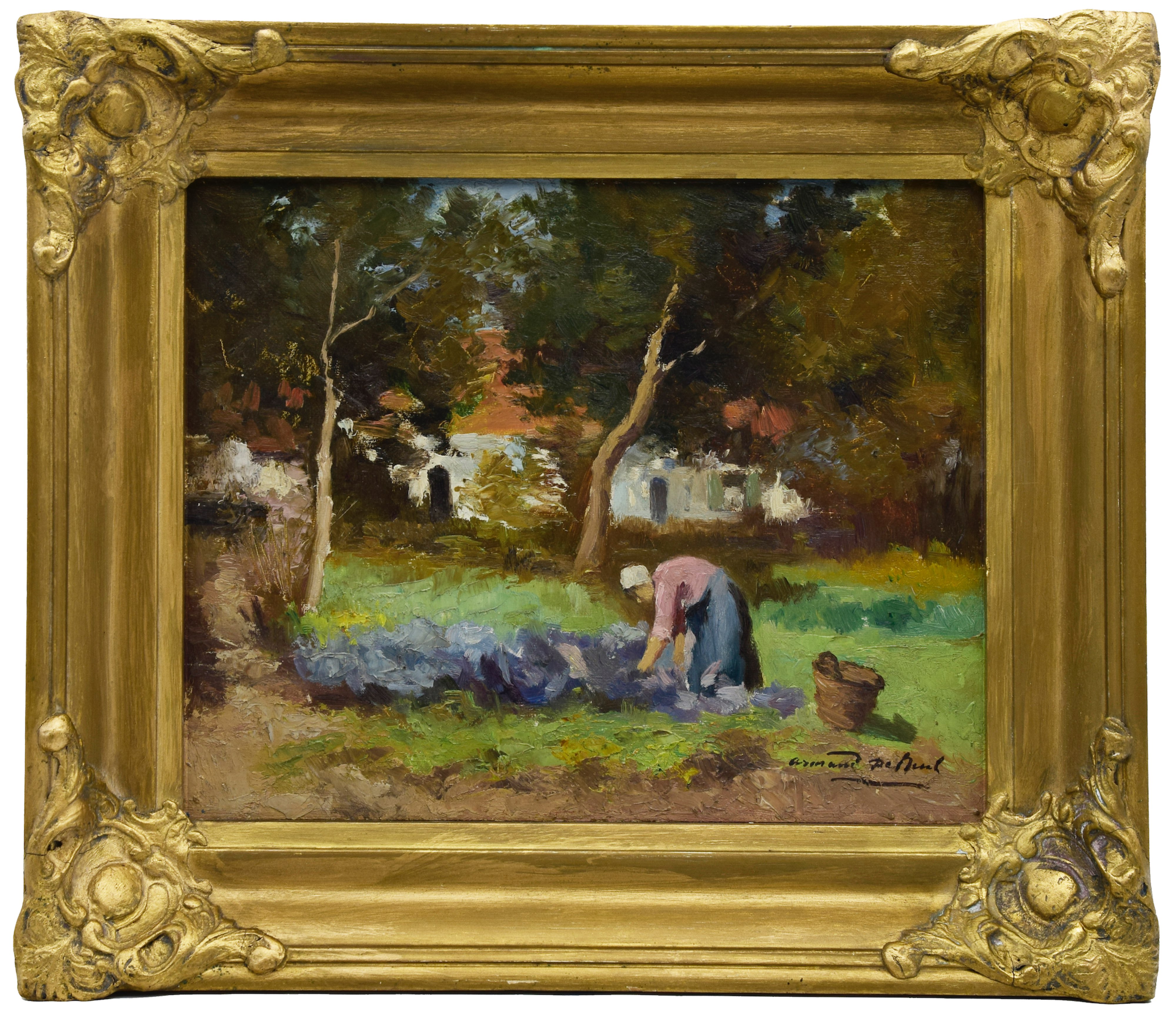 na odwrocie nalepka z odręcznymi informacjami o obrazie w języku francuskim w tym nazwiskiem autora i tytułem.