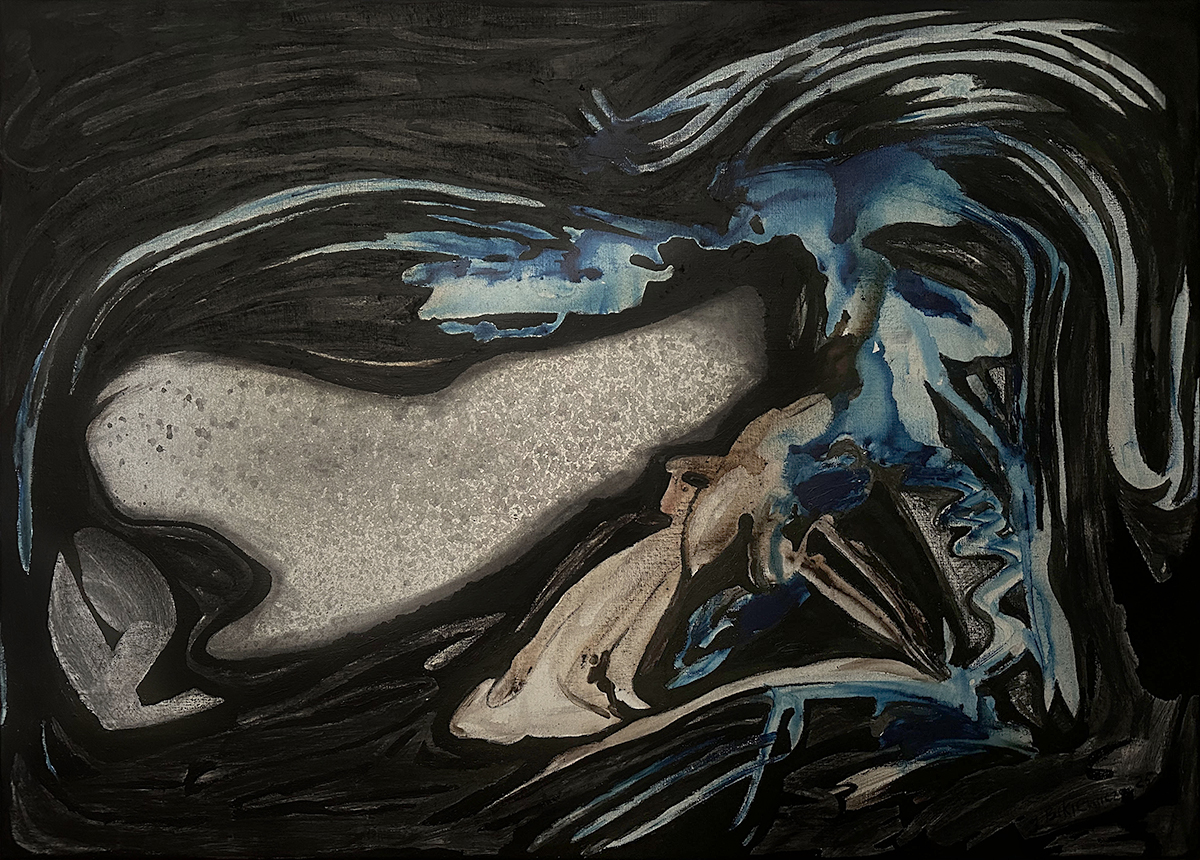 technika mieszana (gwasz, węgiel), płótno, 100 x 140 cm,