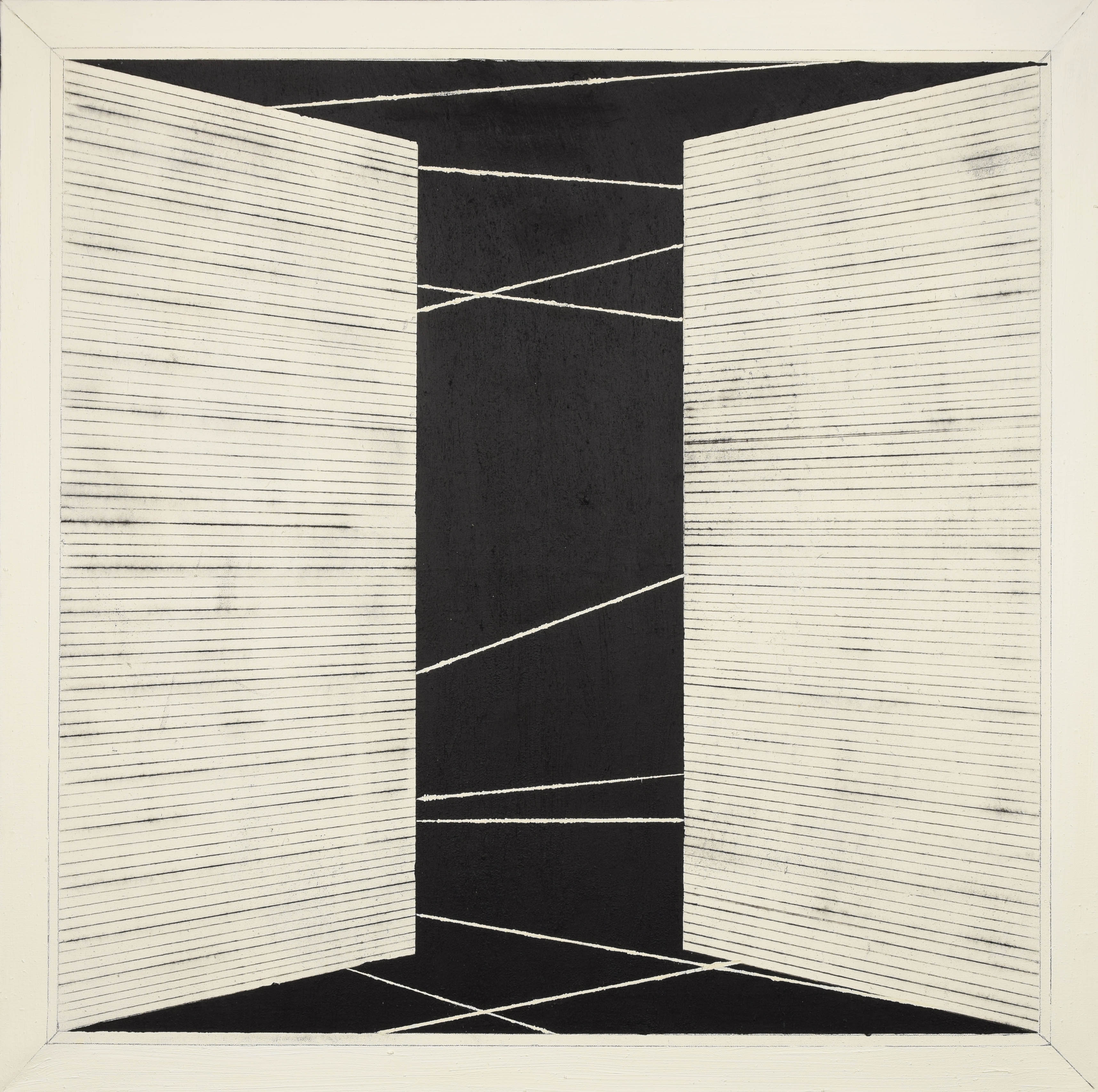 olej, ołówek, pigment, płótno; 100 x 100 cm;sygn., dat. i opisany na odwrocie: KAROLINA ZDUNEK / Z CYKLU "OKNO / 100 x 100 CM OLEJ NA PŁÓTNIE / 2008.
