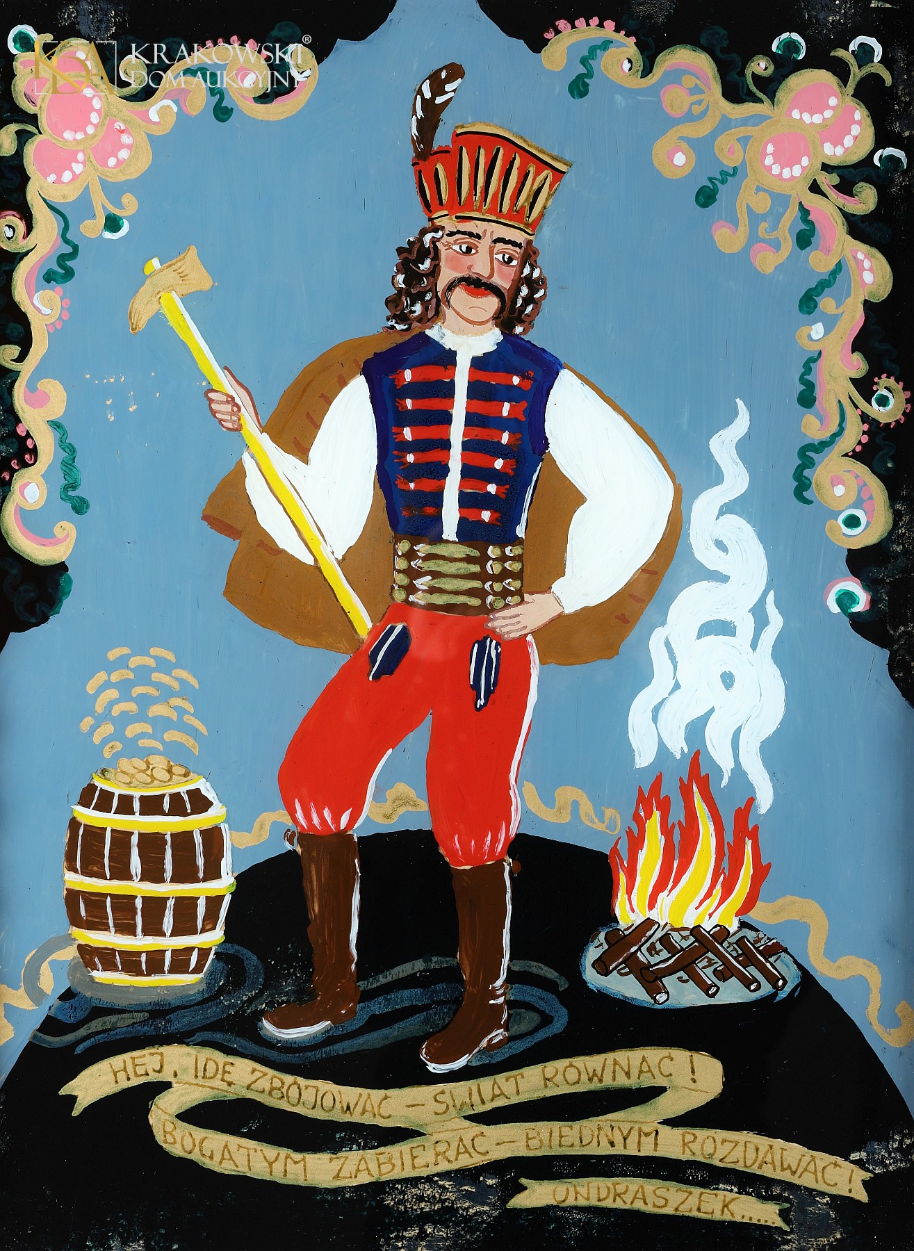 malarstwo na szkle, 43,5 x 32,5 cm (w świetle oprawy),opisany śr.d.: "HEJ, IDĘ ZBÓJOWAĆ - ŚWIAT RÓWNAĆ! | BOGATYM ZABIERAĆ - BIEDNYM ROZDAWAĆ! | ONDRASZEK….."
