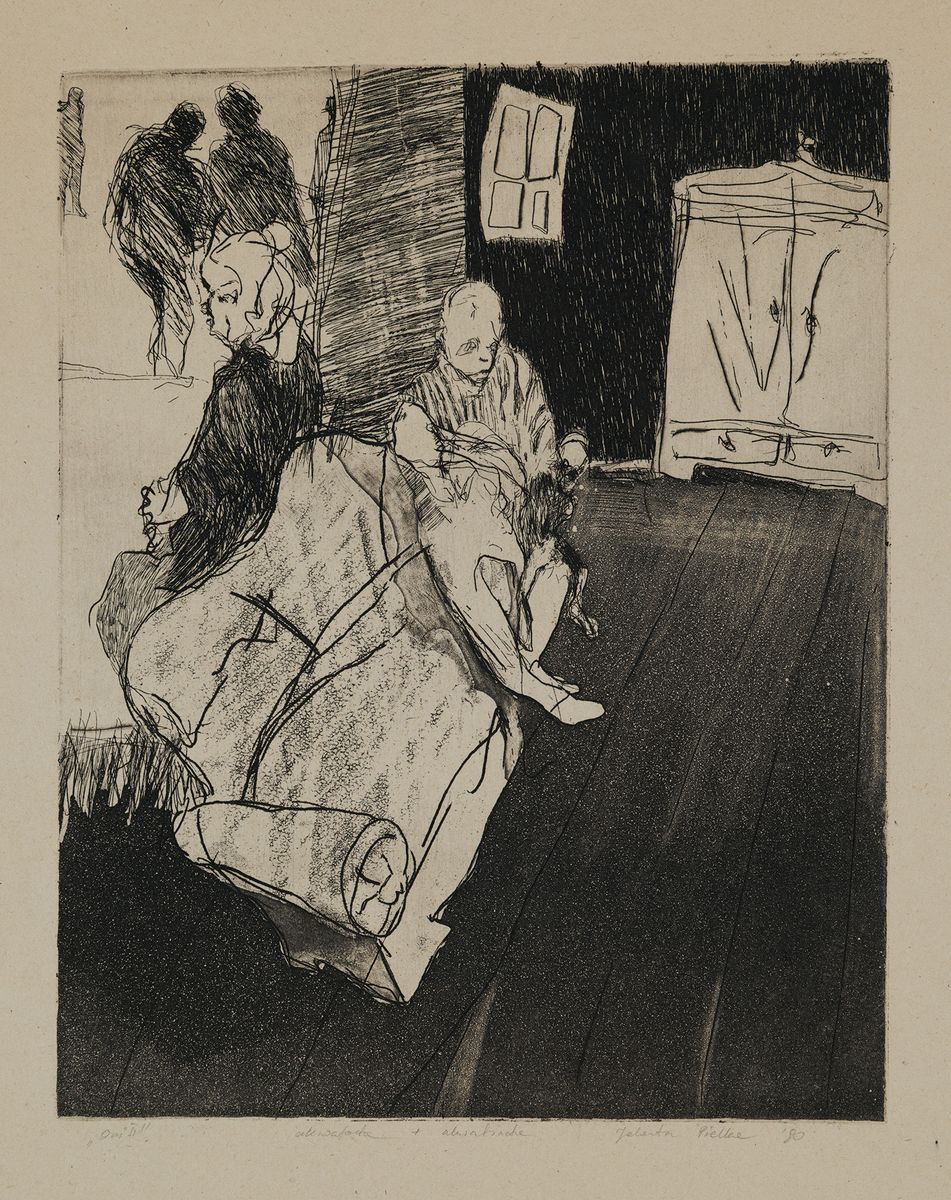 Akwaforta, akwatinta, papier; 31 x 24,3 cm (kompozycja)Sygnowana ołówkiem pod ryciną: „Oni II” akwaforta + akwatinta Jolanta Pielka ‘90