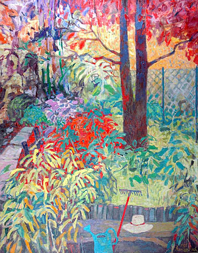 Przedstawiam widok ogrodu jesienią. Był eksponowany na dwóch wystawach indywidualnych: w 2003 r. w Państwowej Galerii Sztuki w Sopocie, w 2004 r. w Wałbrzyskiej Galerii Sztuki w Sopocie. W katalogu wystawy w Sopocie jest wymieniony na str. 64 jako poz. 53. Artysta namalował dwa tego typu pejzaże. Na drugim, nieco mniejszym, o wymiarach 92 x 66 cm, widnieje sylwetka jego żony, Krystyny. Pozostaje on w kolekcji rodziny.