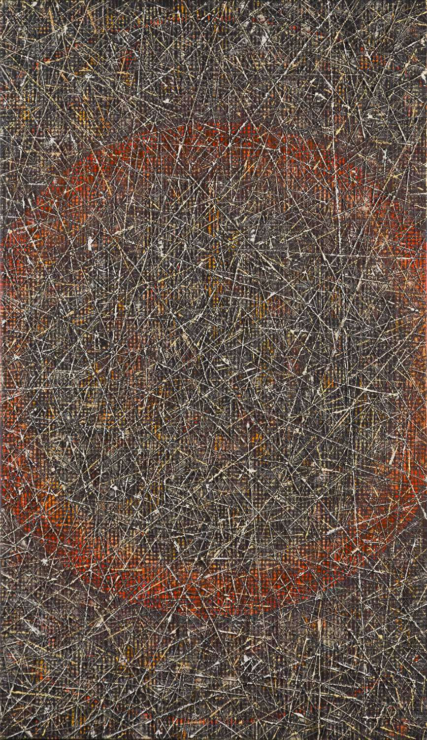 olej/płótno, 190 x 110 cmsygnowany monogramem autorskim p.d.: 'AR'sygnowany, datowany i opisany na odwrociu: 'ALEKSANDER | ROSZKOWSKI | [1165] "ORANŻOWY OKRĄG" | 2017 | DZ.'