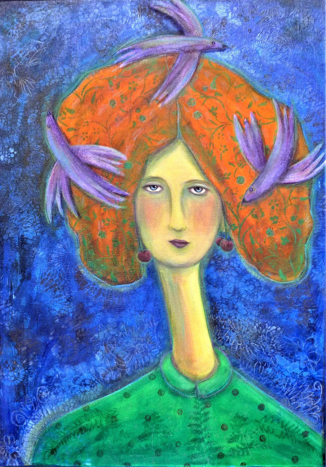 technika mieszana (akryl, kredka akwarelowa), płótno, 70 x 50 cm,