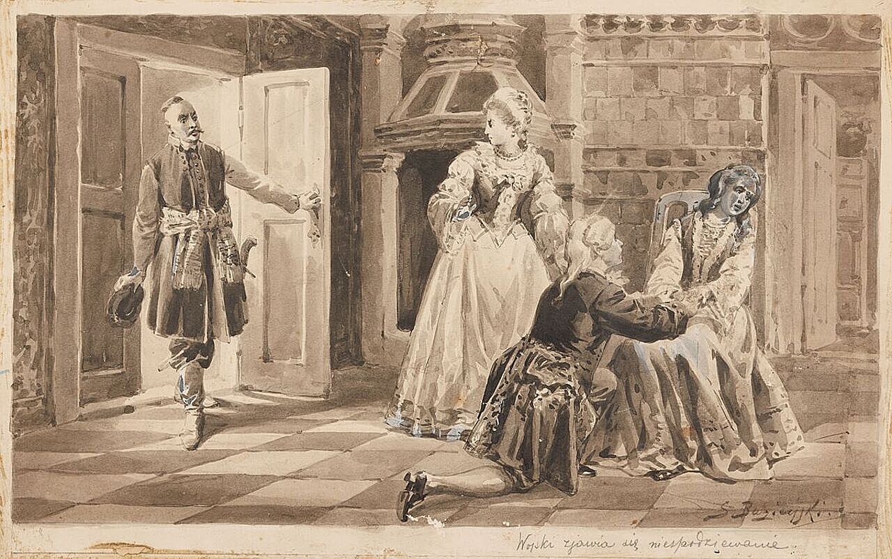 Akwarela, tusz, karton naklejony na tekturę; 28 x 44,5 cm Sygnowany p.d.: S Bagieński; pod kompozycja ołówkiem: Wojski zjawia się niespodziewanie Stan: rozdarcie papieru