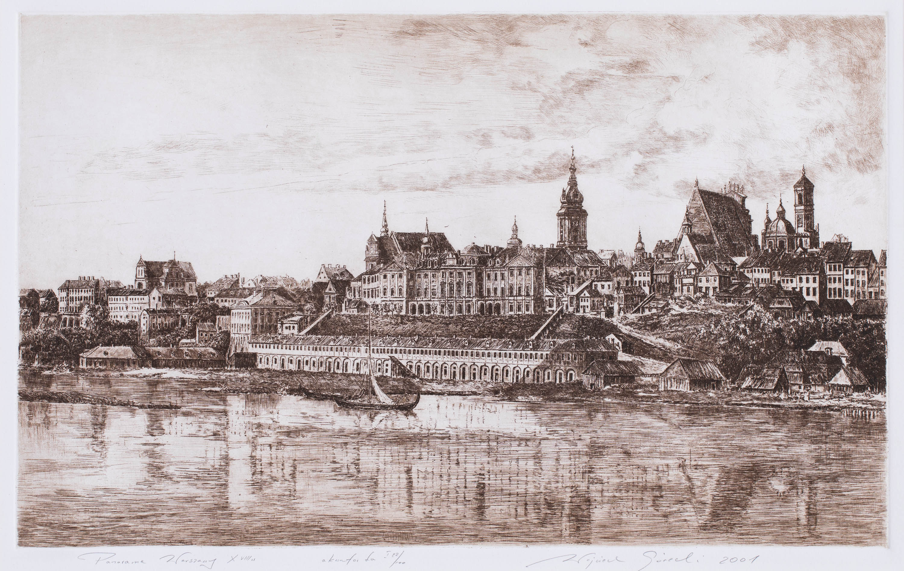 akwaforta, papier, 37,5 x 59 cm w świetle passe-partoutsygn. i dat. ołówkiem p. d.: Wojciech Górecki 2001, opis. ołówkiem l. d.: Panorama Warszawy X VIII w, akwaforta I 22/100