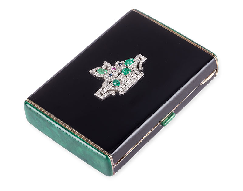 l. 20.-30. XX w. złoto p. 14 , czarna emalia, malachit, 81 szt. diamentów w szlifie 8/8, łącznie ok. 0,50-0,60 ct, VS-SI, I-J, 3 szt. szmaragdów, 2 szt. szafirów, 1 rubin; wym. 7,8 x 5,3 cm