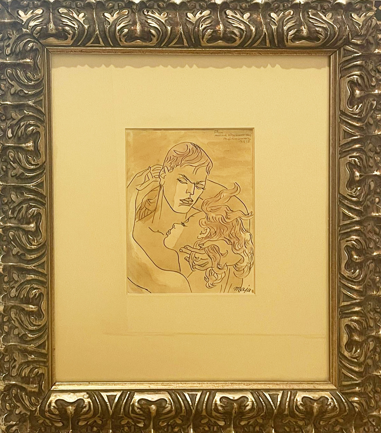 Technika mieszana (tusz/akwarela), papier 18 x 22 cm w świetle passe-partout; wymiary w oprawie 48 x 57 cm; w prawym górnym rogu odręczna dedykacja artysty: „Pani Halinie Krzyżanowskiej/Maja Berezowska/7.3.58” sygnowany w prawym dolnym rogu: Maja