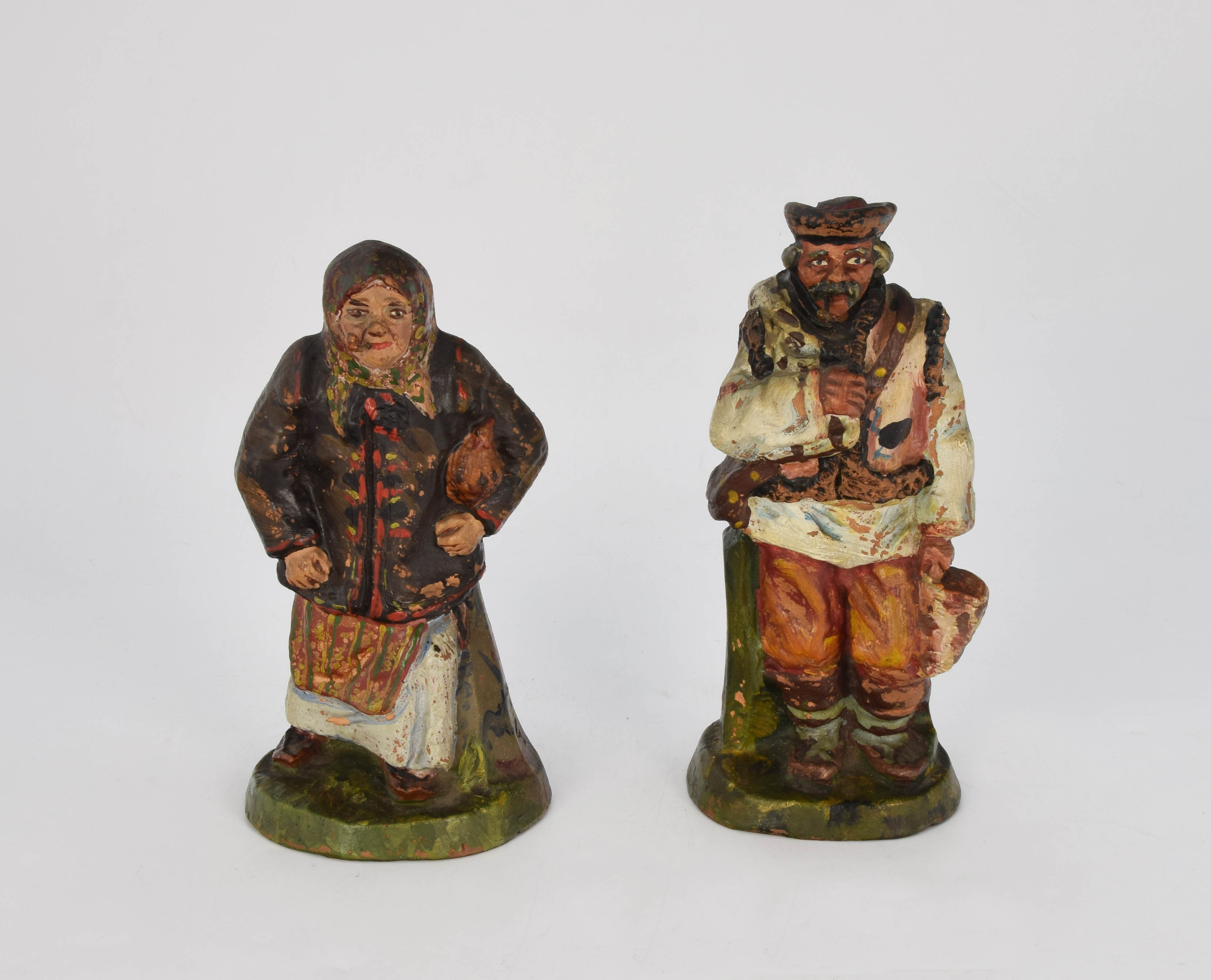 Figurki Hucuła i Hucułki z fajeczkami - lulkami w ustach. Hucułka w chustce - rańtuchu, długiej jasnej koszuli, zapaskach, krótkim kubraku lamowanym czerwono i postołach (kierpcach); pod pachą trzyma kurę. Wąsaty Hucuł w kapeluszu, koszuli, keptarze (bezrękawniku), szerokich spodniach, onucach i postołach (kierpcach), z przewieszoną na skos torbą i workiem zarzuconym na plecy.