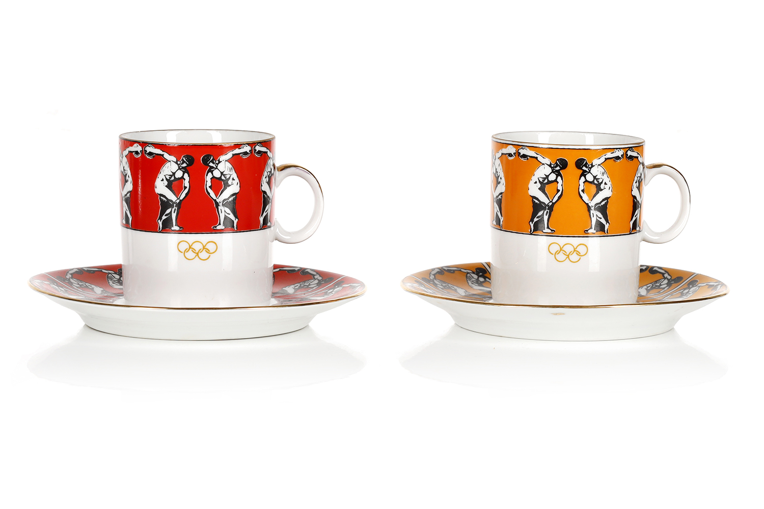 porcelana szkliwiona, złocona, kalka ceramiczna; filiżanka wys. 7 cm, średn. spodka: 13,5 cm sygn. na spodzie: korona / Karolina / MADE IN POLAND Zakłady Porcelany Stołowej "Karolina" w Jaworzynie Śląskiej, lata 60. / 70. XX w.